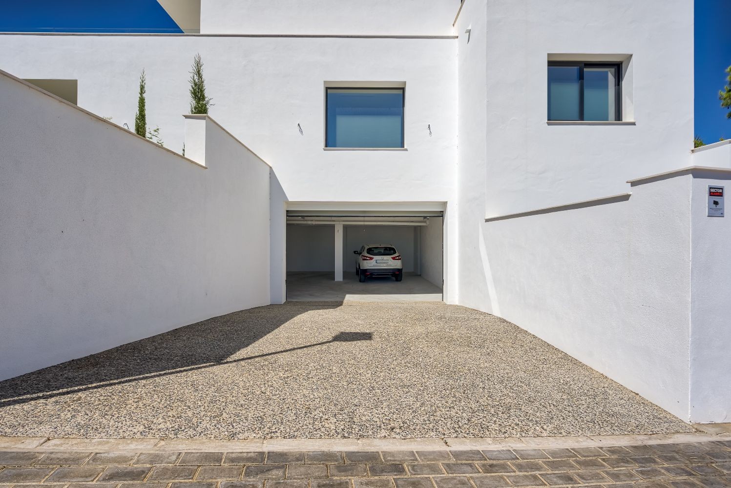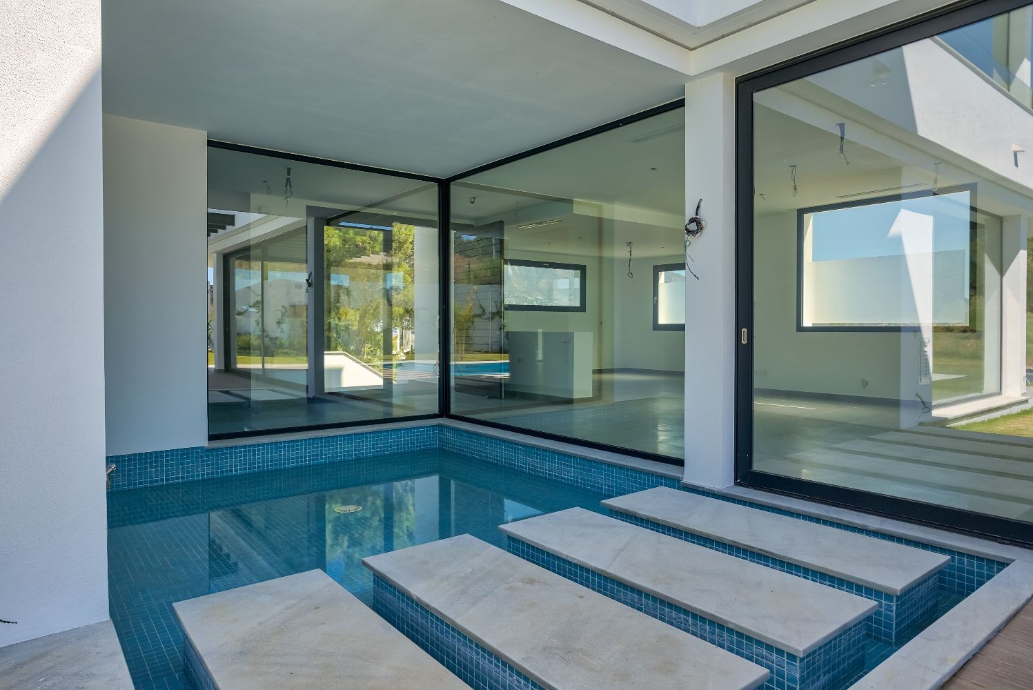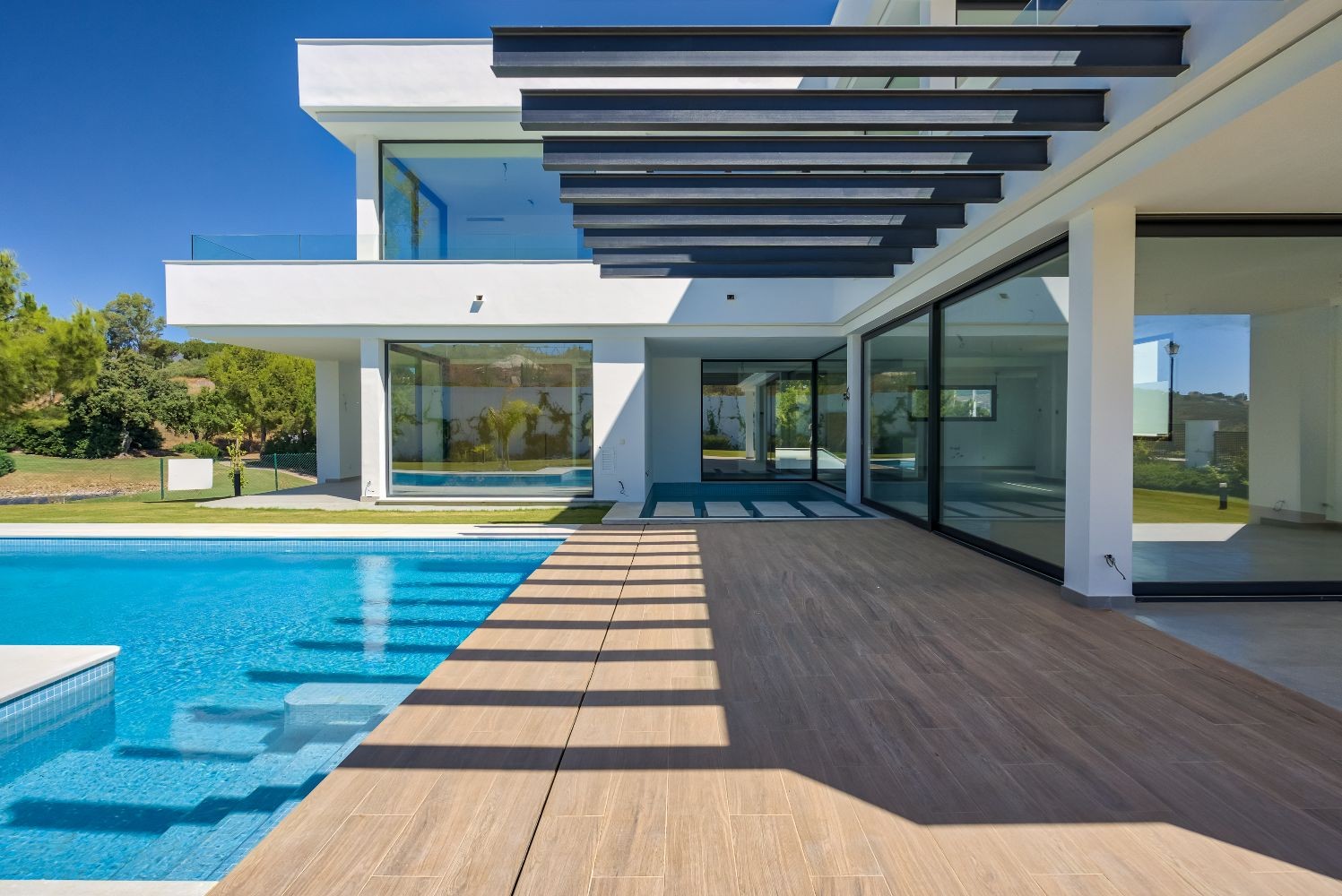 The location enjoys an extreme tranquility.Description: Entering through a large portal with remote control is a garage with capacity for 5 cars, spacious and bright connected to the side of the machine room (pool cleaner, heat pump for the underfloor heating throughout the villa, 2 tanks of water reserve and site for tools), on the other a large surface for laundry and another that could be used as a leisure place, a cinema or even an office with the possibility of installing a large window.A wide central staircase with space for a possible hydraulic glazed elevator(optional), communicates to the next floor and entrance/reception, being left a good surface for the kitchen in an open plan, annexing the living and dining room, bordered by an exceptional pool and leisure and comfort area for "alfresco" meals under a design pergola. The access to the terrace and garden areas is through two huge windows that reach from the floor to the ceiling. Towards the right side of the entrance to the villa there is a complete bathroom and an office or bedroom for guests that focus on the pool on one side and a covered porch and garden with views over the lake at Hole6 of the golf course by the other. On the upper floor, there are three additional bedrooms; one of them is the master bedroom with bathroom on suite a large terrace with excellent views and a spectacular dressing room.