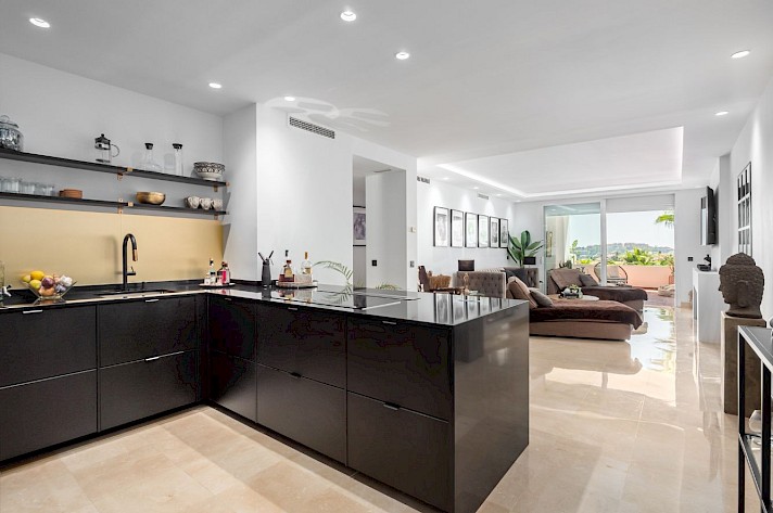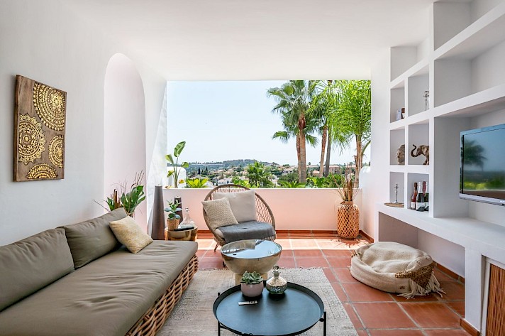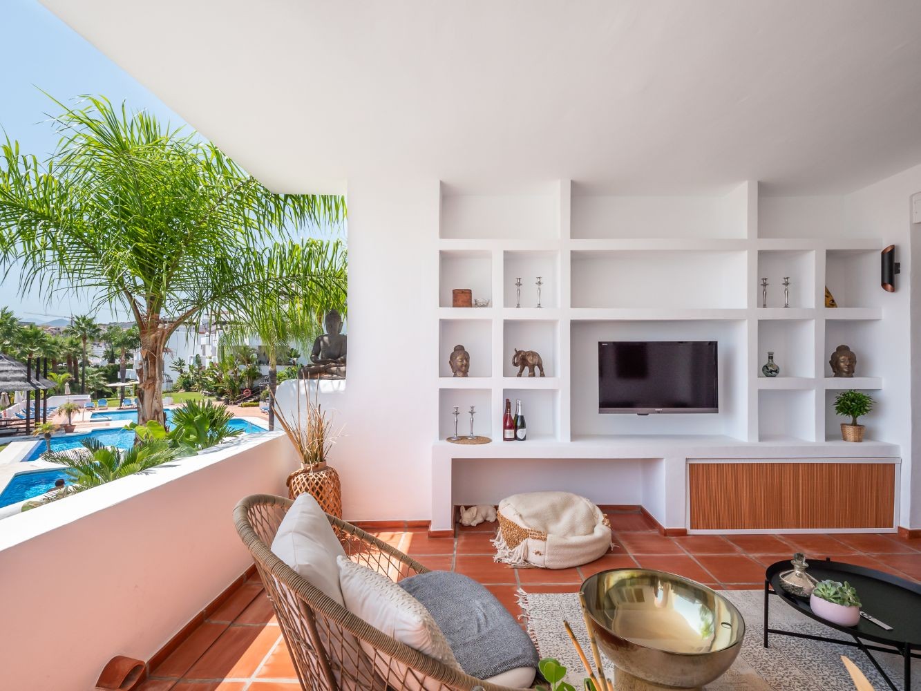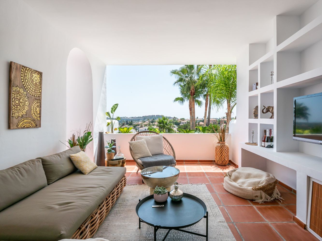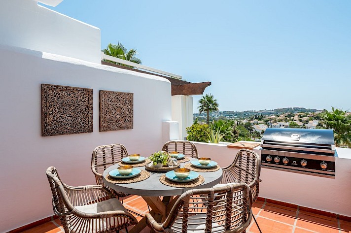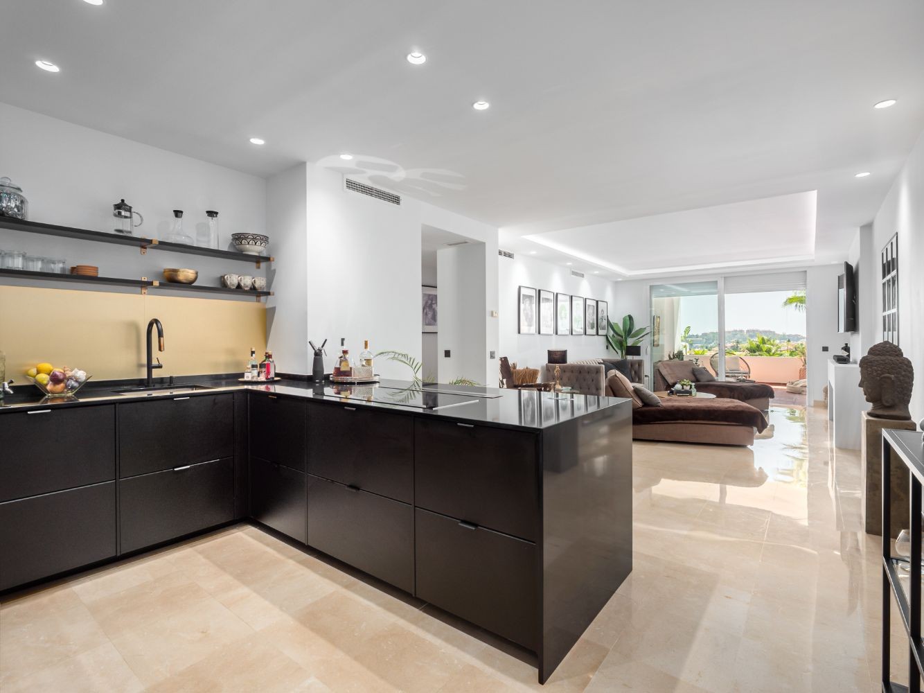 Located in a prestigous urbanization, in the hills of Nueva Andalucia. Direct access from the garage up to the renovated apartment with 3 bedrooms and 2 bathrooms, open floor plan with kitchen and living room area. From the living room area and master bedroom with direct access to the spacious terrace with lounge, dining and barbeque area, and a fantastic view over Gibraltar to the afternoon and evening sun.