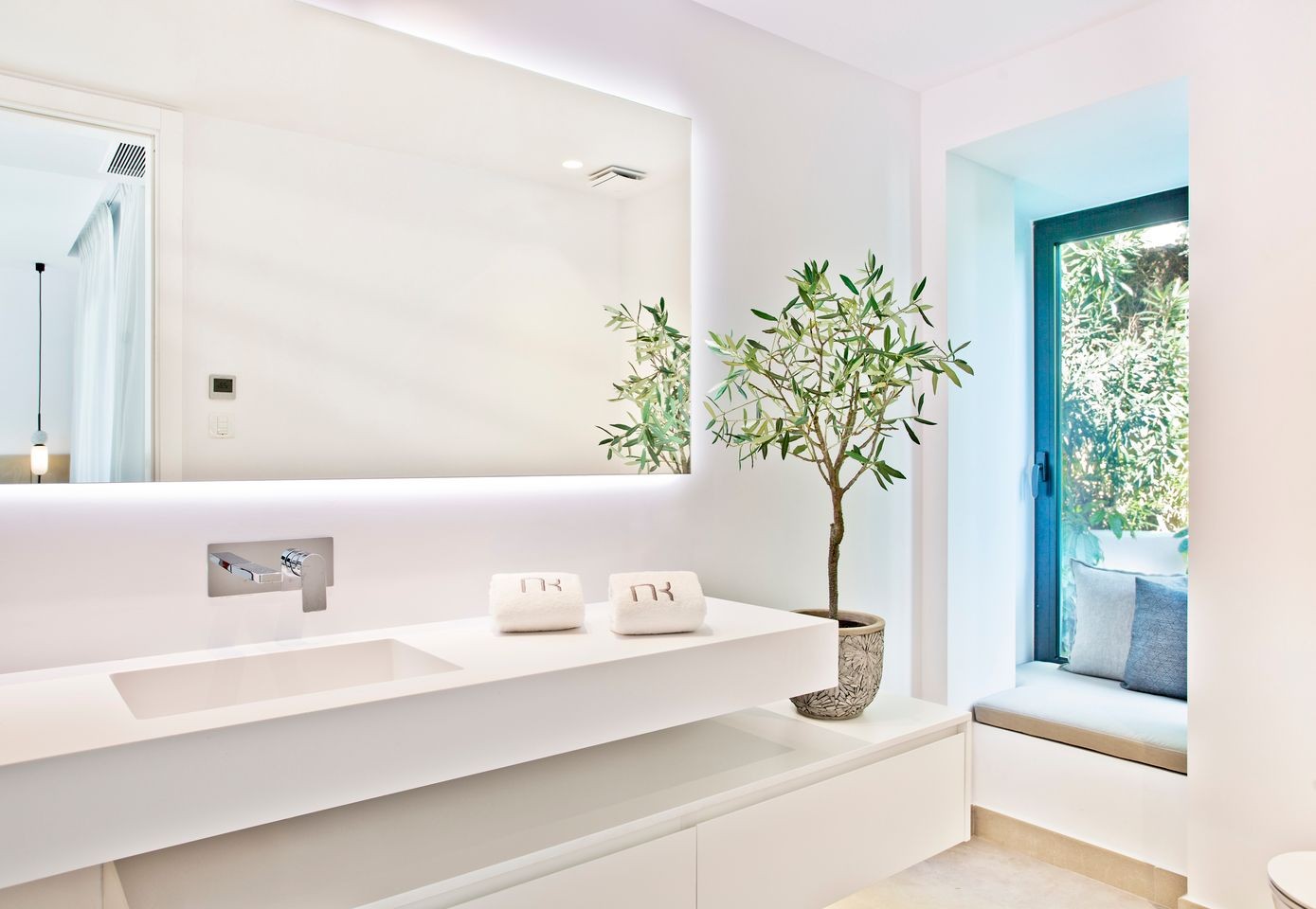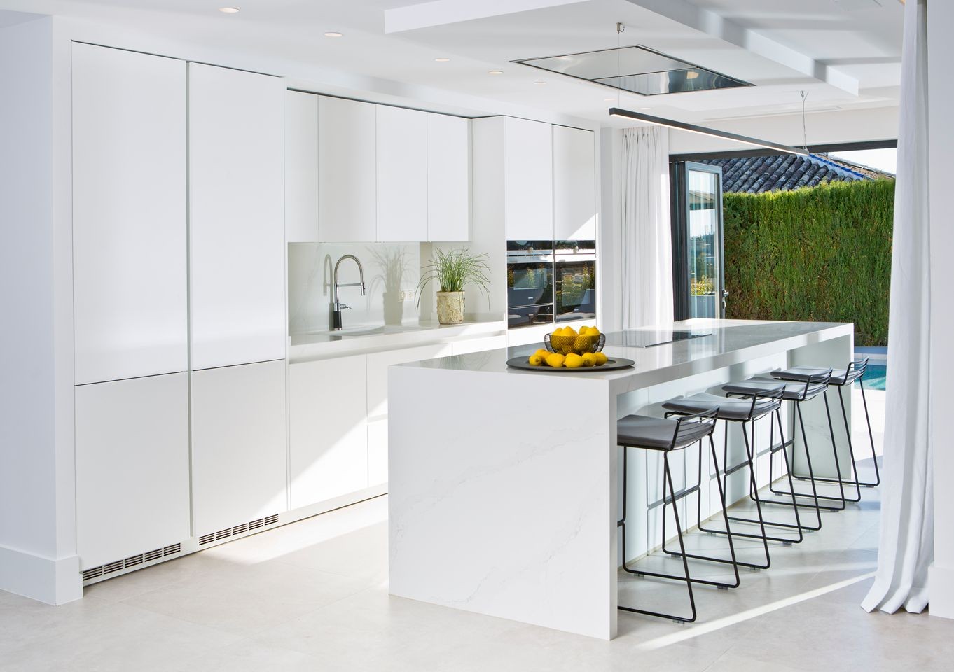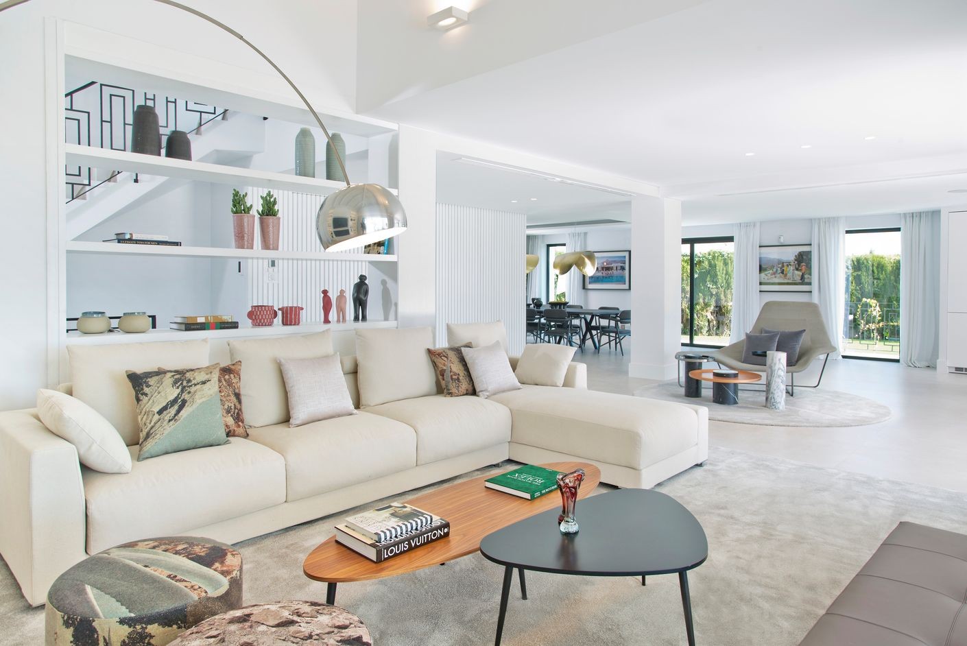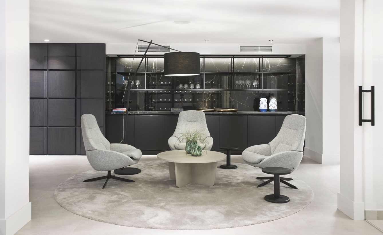 It immediately welcomes you with an impressive driveway leading up to the entrance of the home. The entrance has double-height ceilings with great natural light and gives you a striking overview of the open-plan layout. On this level, you have a spacious living area, connected with both dining and kitchen. It has been designed with white wooden details and marble countertops to create a modern and homely feel.
