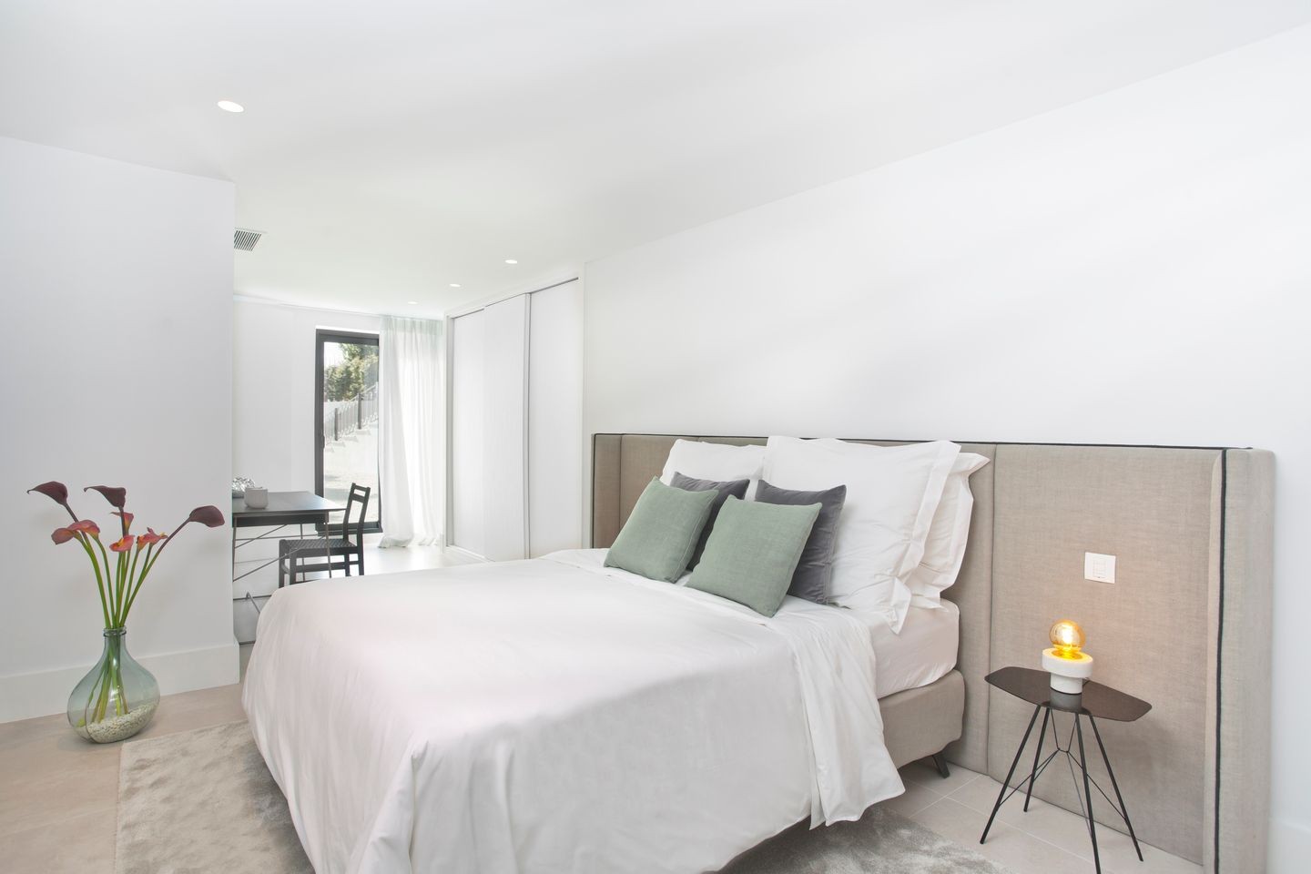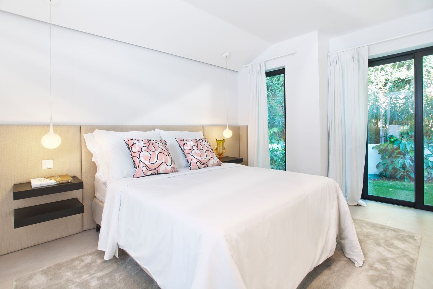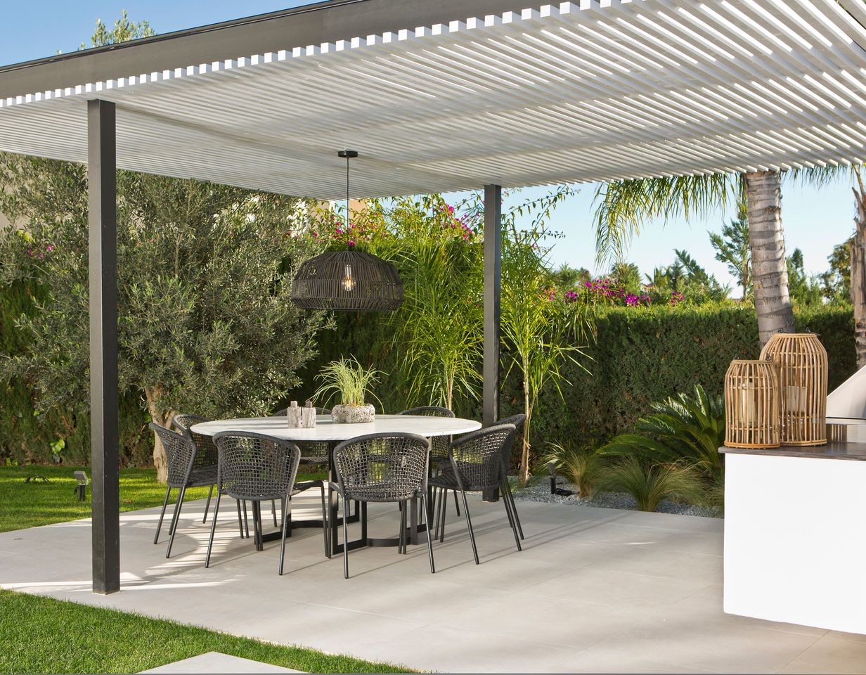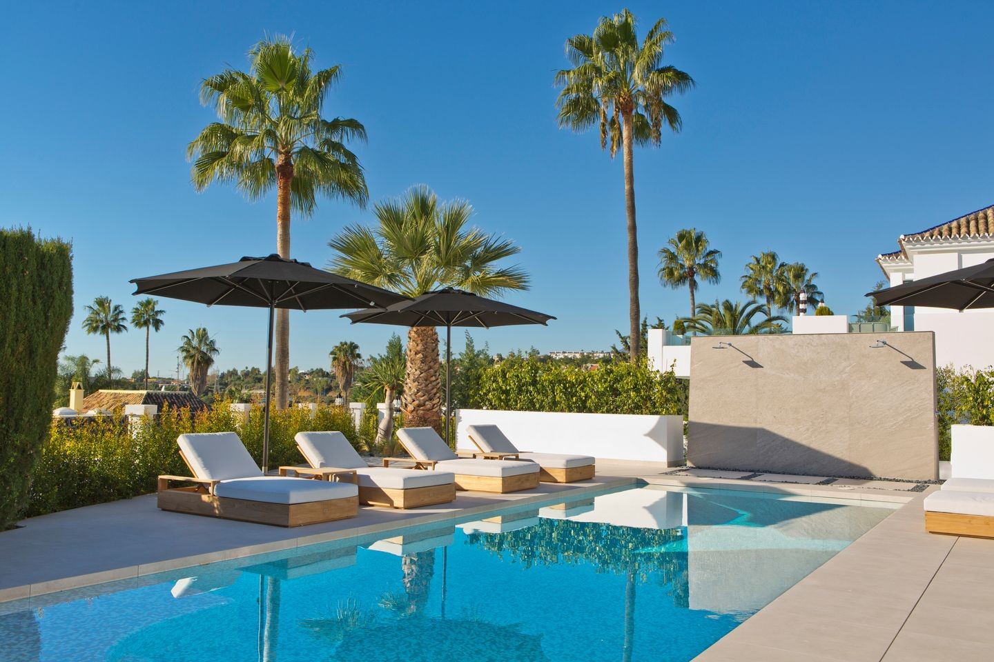 Large open windows that are showcasing the beautiful outdoor dining, garden and pool. From here you also have open views to the golf course and sea. The villa is south facing and has sun all day. Connected closely to the kitchen there is a gazebo with dining and an outdoor kitchen where you can enjoy the afternoon sun. On this level, you have two guest bedrooms en suite.