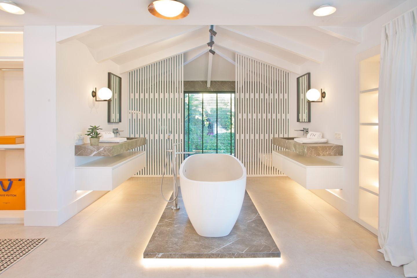 The stairs in the entrance will lead you to the master suite, where we have dedicated the whole upper floor for the owner to have a master they deserve. Impressive bedroom with generous space for both a king-size bed and living room. A walk-in closet with automatically closing curtains and a bathroom with his and hers sink, shower and bathtub.
