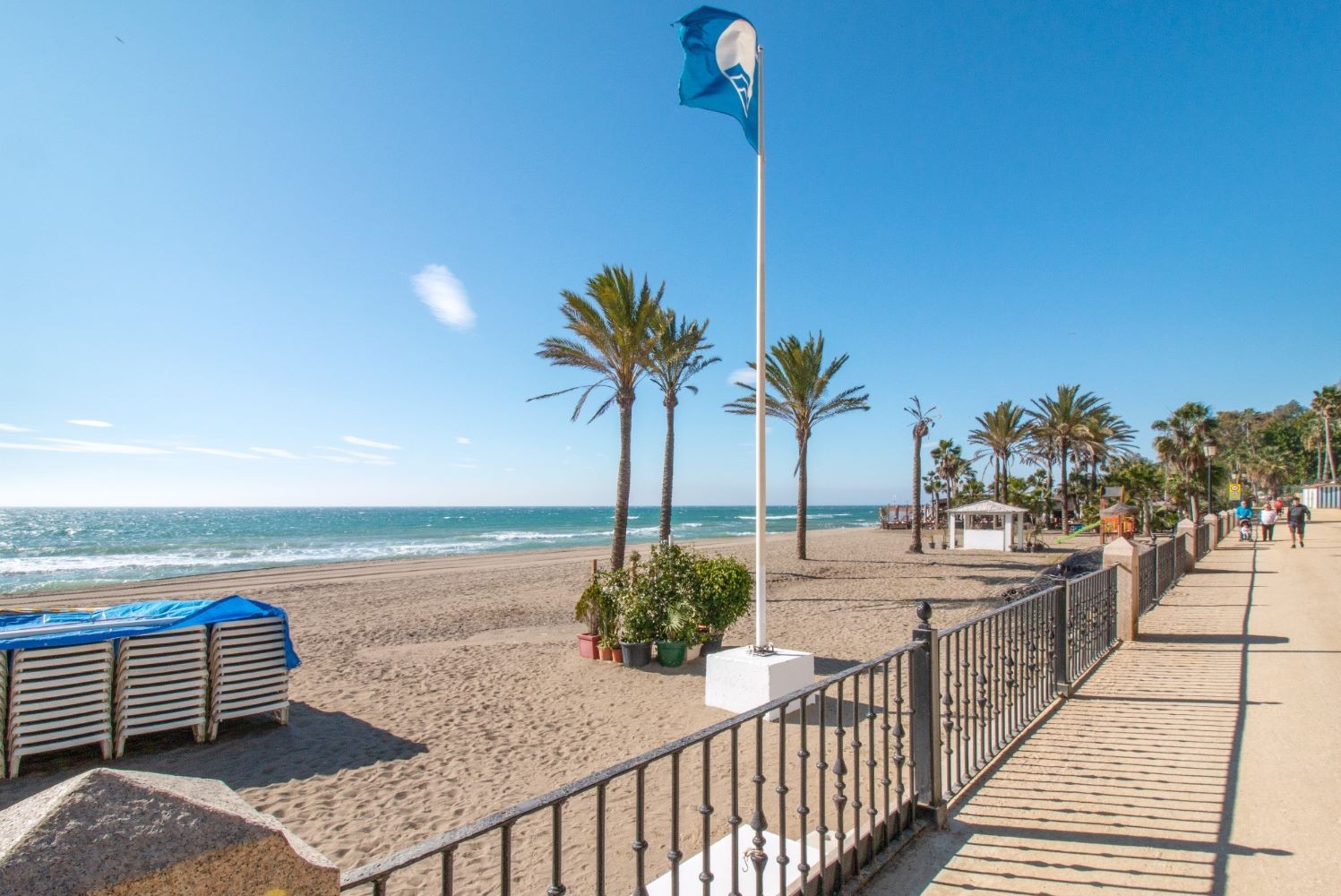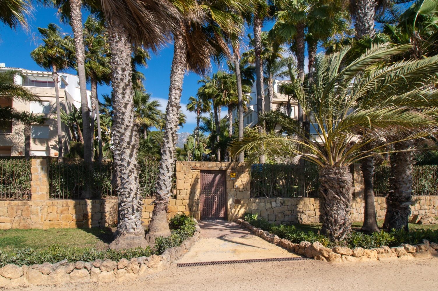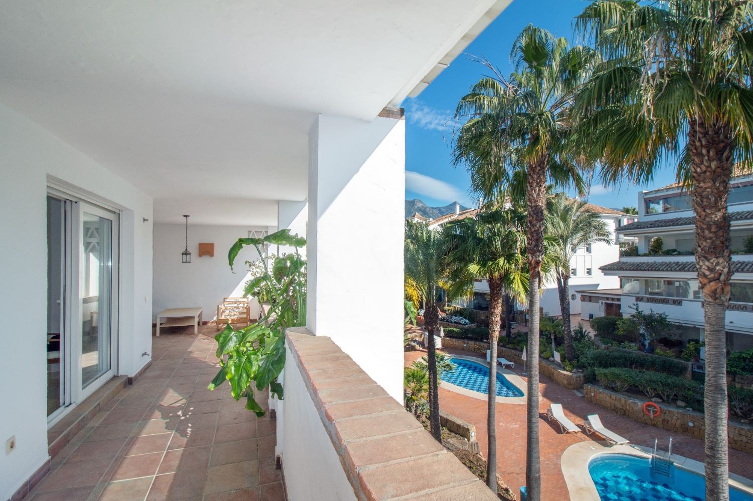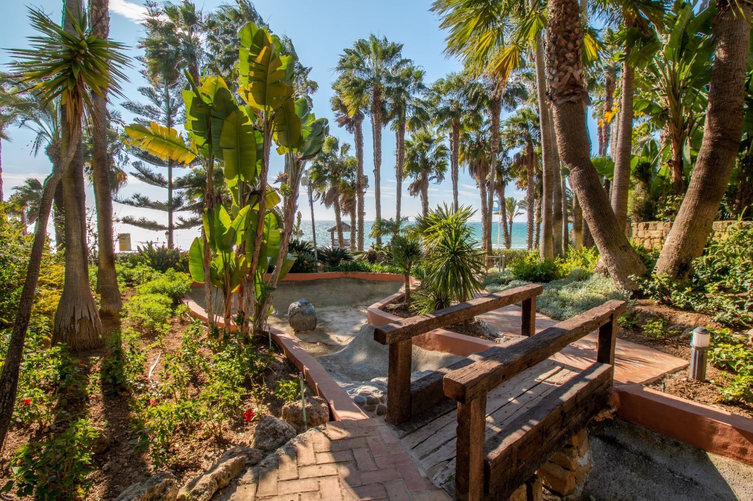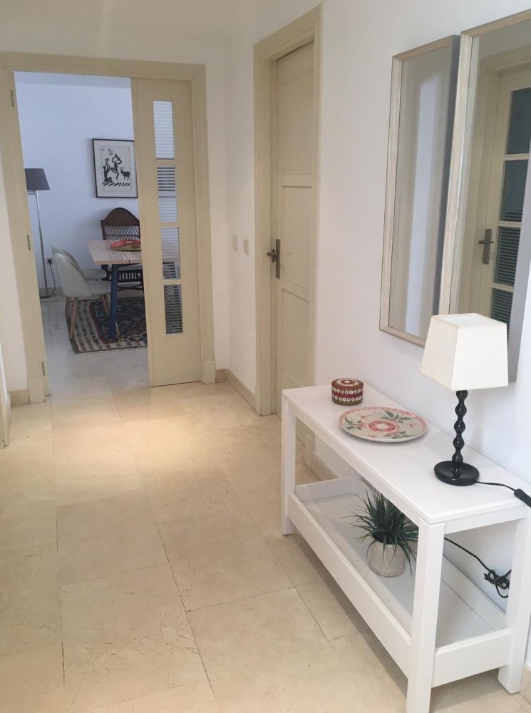 This 2 bedroom apartment is located in a beachfront gated community in Marbella's Golden Mile with beautiful tropical gardens and four swimming pools. The lighty property enjoys morning sun and comprises a large entrance hall, living/dining room opening onto a spacious covered terrace overlooking the gardens and swimming pools towards the mountains and the sea. Master bedroom with en-suite bathroom, guest bedroom with separate bathroom and fully fitted kitchen with breakfast area and adjoined utility room. Both bedrooms have access to the terrace. Other features include: underground car parking space and A/C hot and cold. The gated complex is within walking distance to restaurants, supermarkets and other amenities . 24hr security service, concierge and direct access to the promenade, El Trocadero and the beach. A superb property, close to all amenities and within a five minute drive to Marbella centre and Puerto Banus.