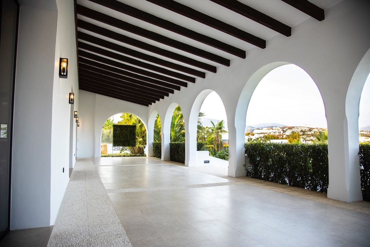 The house comprises a beautiful entrance hall, contemporary open plan kitchen with NEFF appliances, spacious living/dining room with fireplace and access to a covered terrace, pool and garden area where you can enjoy the panoramic towards La Concha mountain and partial sea views .