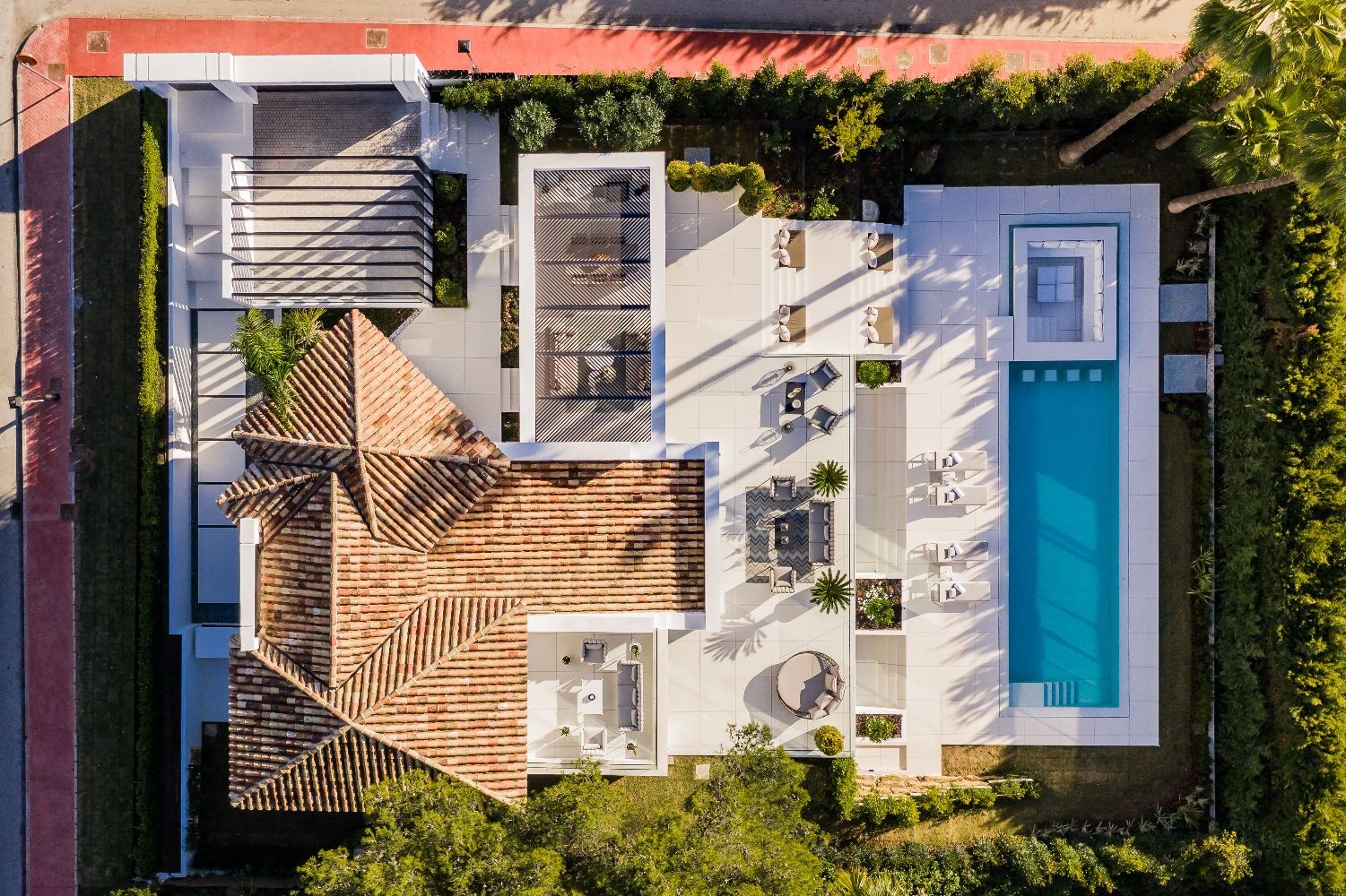 This fantastic villa is located in the heart of the Golf Valley, in an exclusive area between Real Club de Golf Las Brisas and Aloha Club Golf, Nueva Andalucía. The property has been completely renovated using the best materials, is facing South-East and has a spectacular swimming pool area for enjoying the sunny days that the Costa del Sol offers. In addition, it has an individual apartment with direct access to the swimming pool. The property offers privacy and is ready for moving in with all the amenities available.