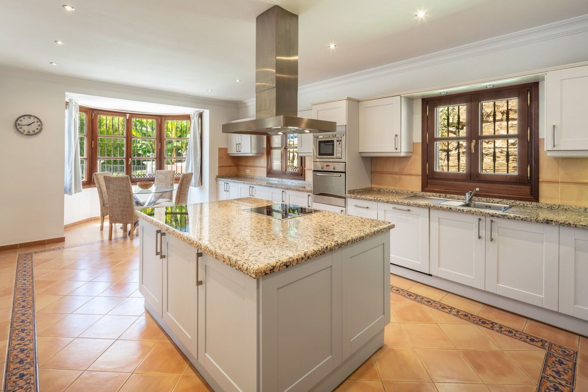 Distributed over three levels, the villa comprises, on the entrance level; a large dining room and living room, spacious kitchen featuring a large central island and incorporating a breakfast area benefitting from the natural light of the bay windows and views of the banana trees. The entrance hallway has access to the guest toilet and to the two generous guest bedrooms sharing one bathroom. Terrace access is from the living room and leads down to the pool area beyond.