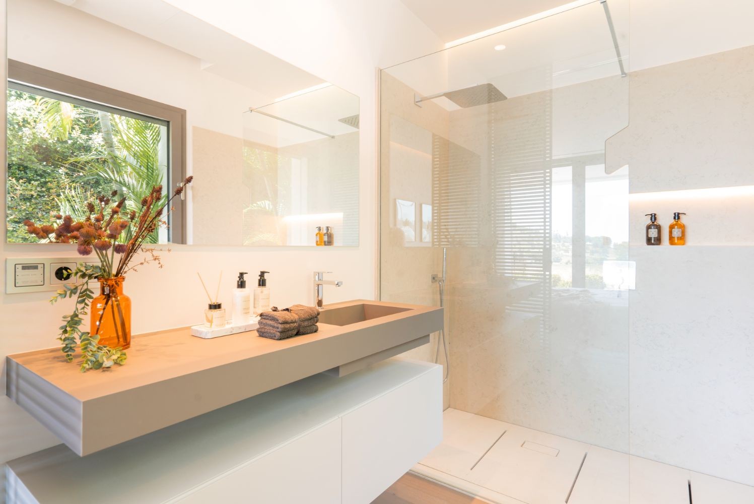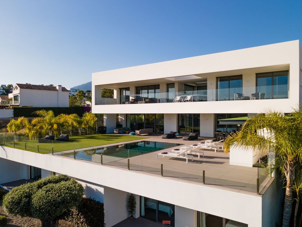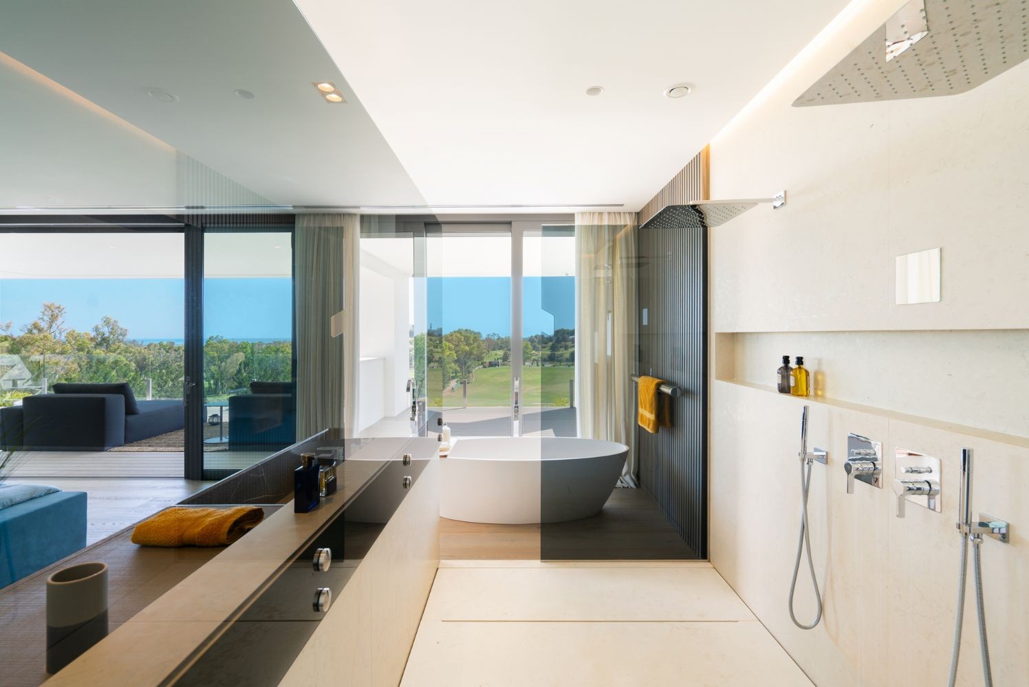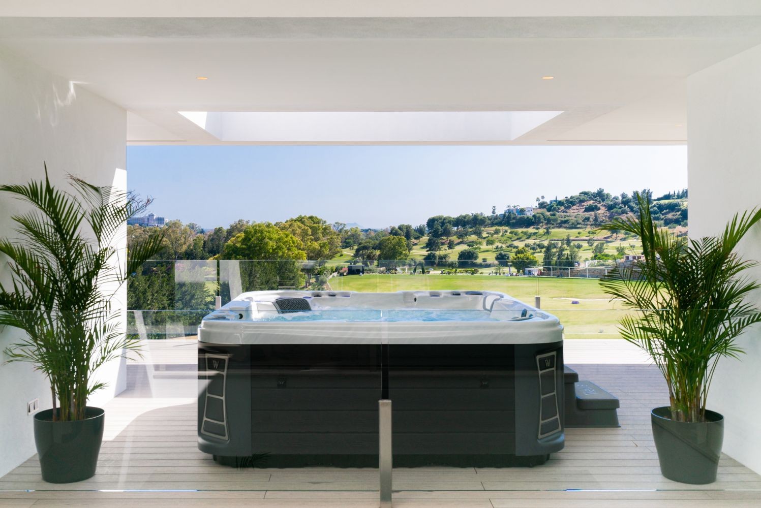On the first floor, the west wing belongs entirely to the master suite. The east wing comprises a games/study/tv room and two bedrooms in-suite. All rooms boast stunning views of the golf, sea, and Gibraltar! And to enjoy the views to the full, you have a big and very private jacuzzi on the terrace.
