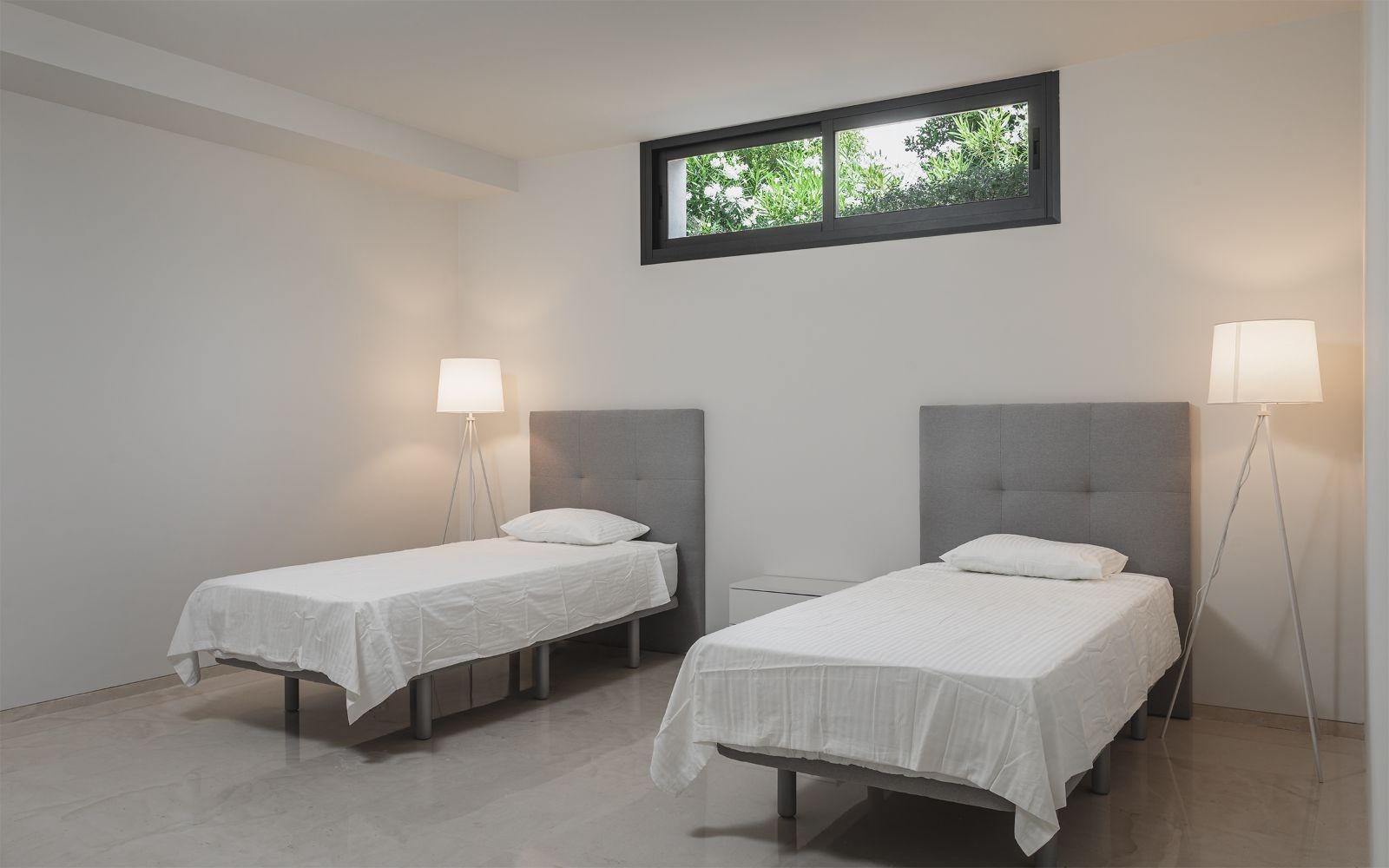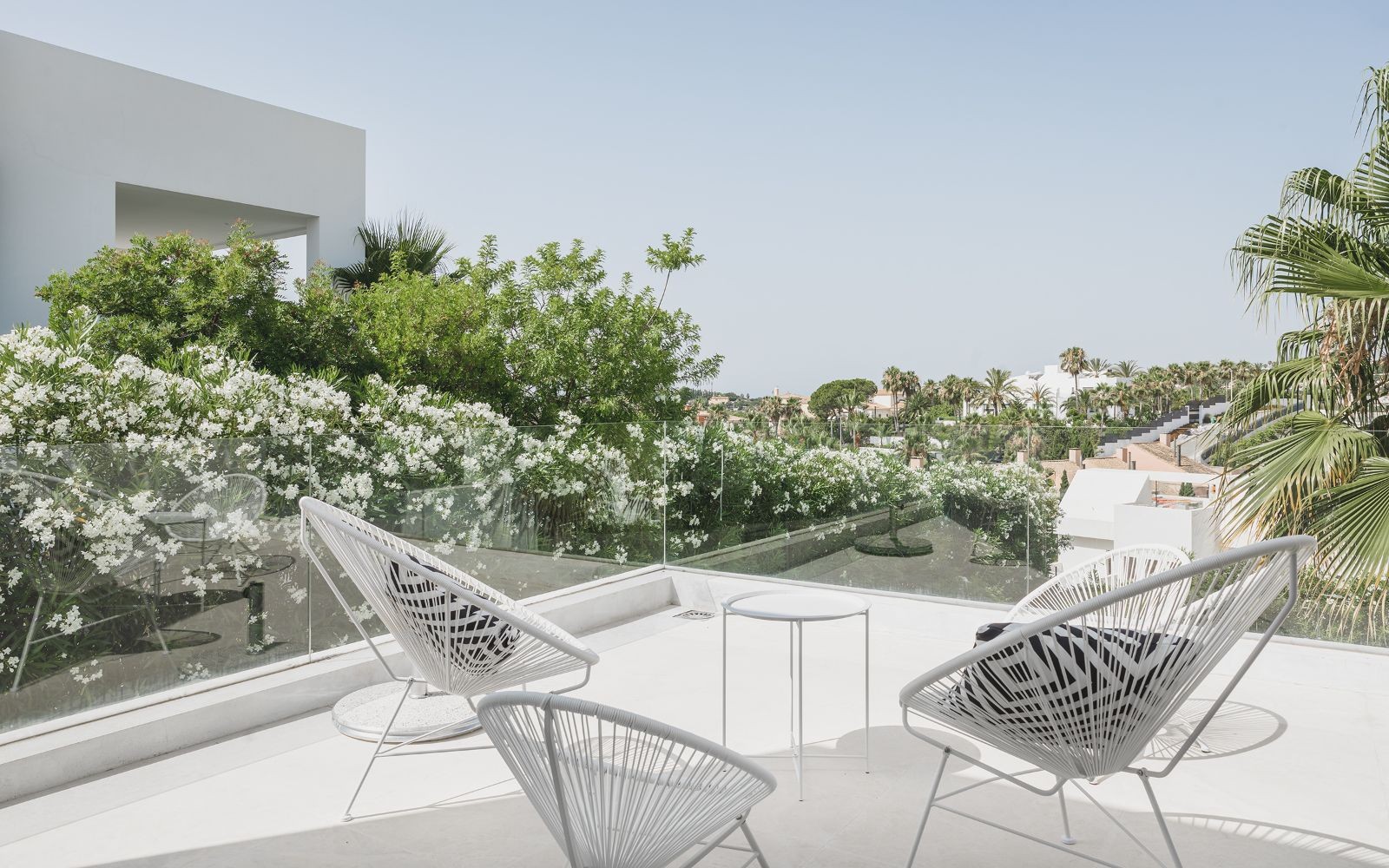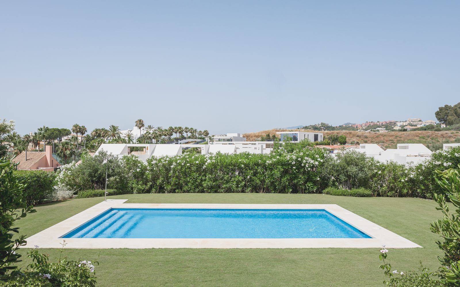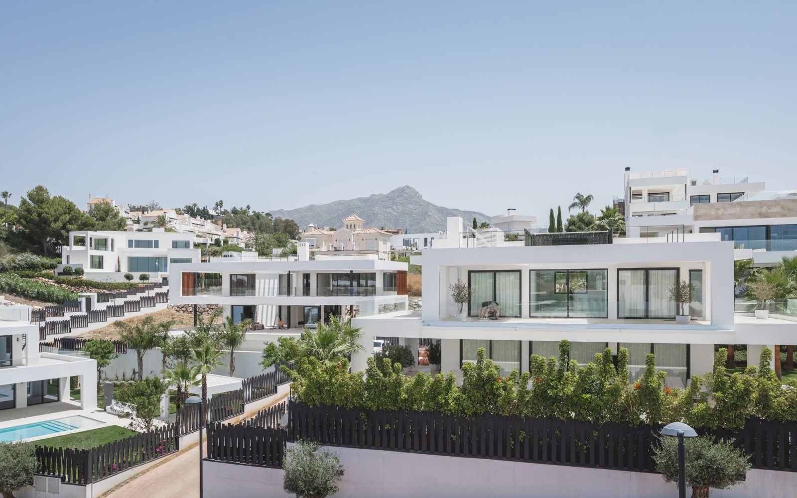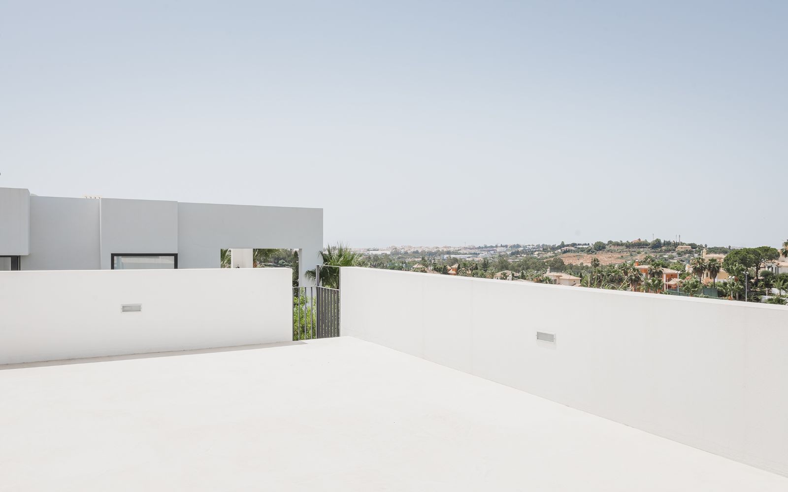 Brand-new contemporary luxury villa in a prestigious location in the famous Golf Valley, with the spectacular backdrop of Marbella’s iconic La Concha Mountain. Recently built to top specifications and finishes, this 5-bedroom villa pays special attention to the Andalusian climate, with plenty of outside seating areas carefully shaded and perfect for relaxing. Distributed on three levels plus rooftop solarium, it comprises, on the main floor: spacious living room with several seating areas; open-plan fully fitted kitchen/dining area equipped with top appliances and with a central island and wine cooler; 2 en-suite guest bedrooms; access to the porches, terraces, swimming pool and the carefully landscaped garden with mature plants that surround the property create privacy from nearby homes. Upstairs: two guest en-suite bedrooms with fabulous views over the Golf Valley, one of them with access to a private terrace; stunning master suite with dressing room and access to a private terrace also enjoying the amazing views. Lower level: garage for 3 cars; utility room; laundry room; storage room; guest toilet. Special features include underfloor heating in the bathrooms, domotic and music system throughout. Just minutes away from several international schools, gastronomic experiences and amenities, this magnificent corner villa is set within a quiet gated complex with 24-hour security, guaranteeing a total privacy.