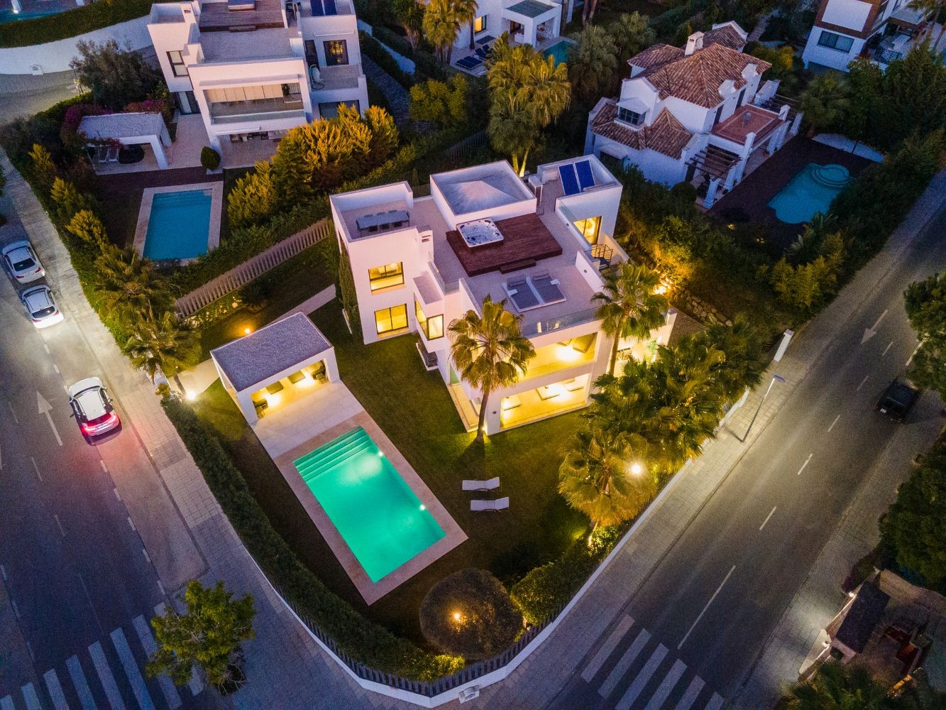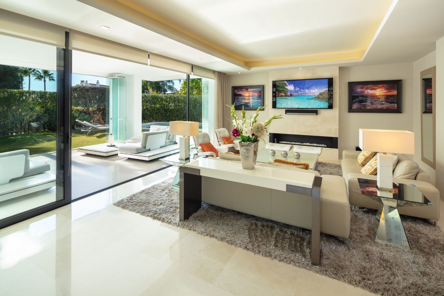The living area is connected to the covered terrace and the manicured garden of this luxury home. The terraces boast a dining area and chill-out spaces to enjoy the sunny weather all year round by the pool. The villa enjoys generous bedrooms on the upper level, with direct access to a sunny private terrace.