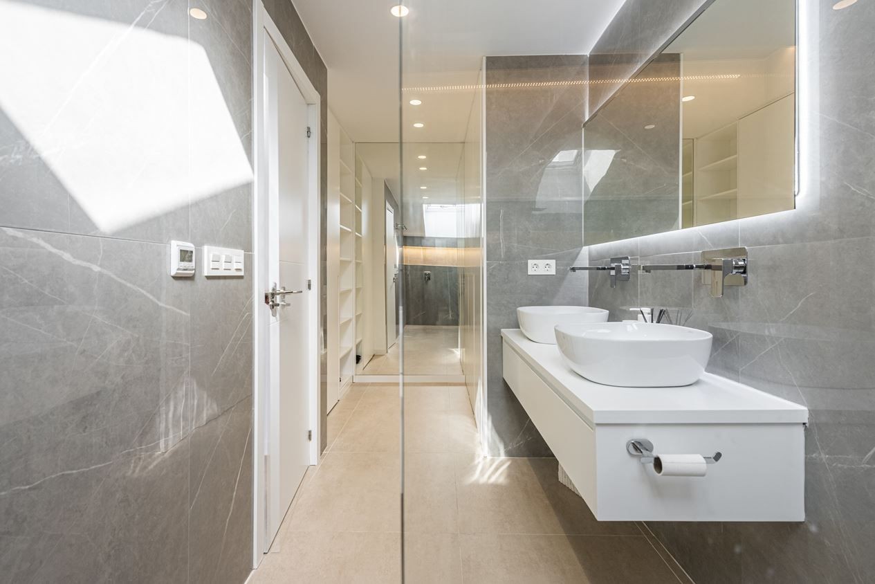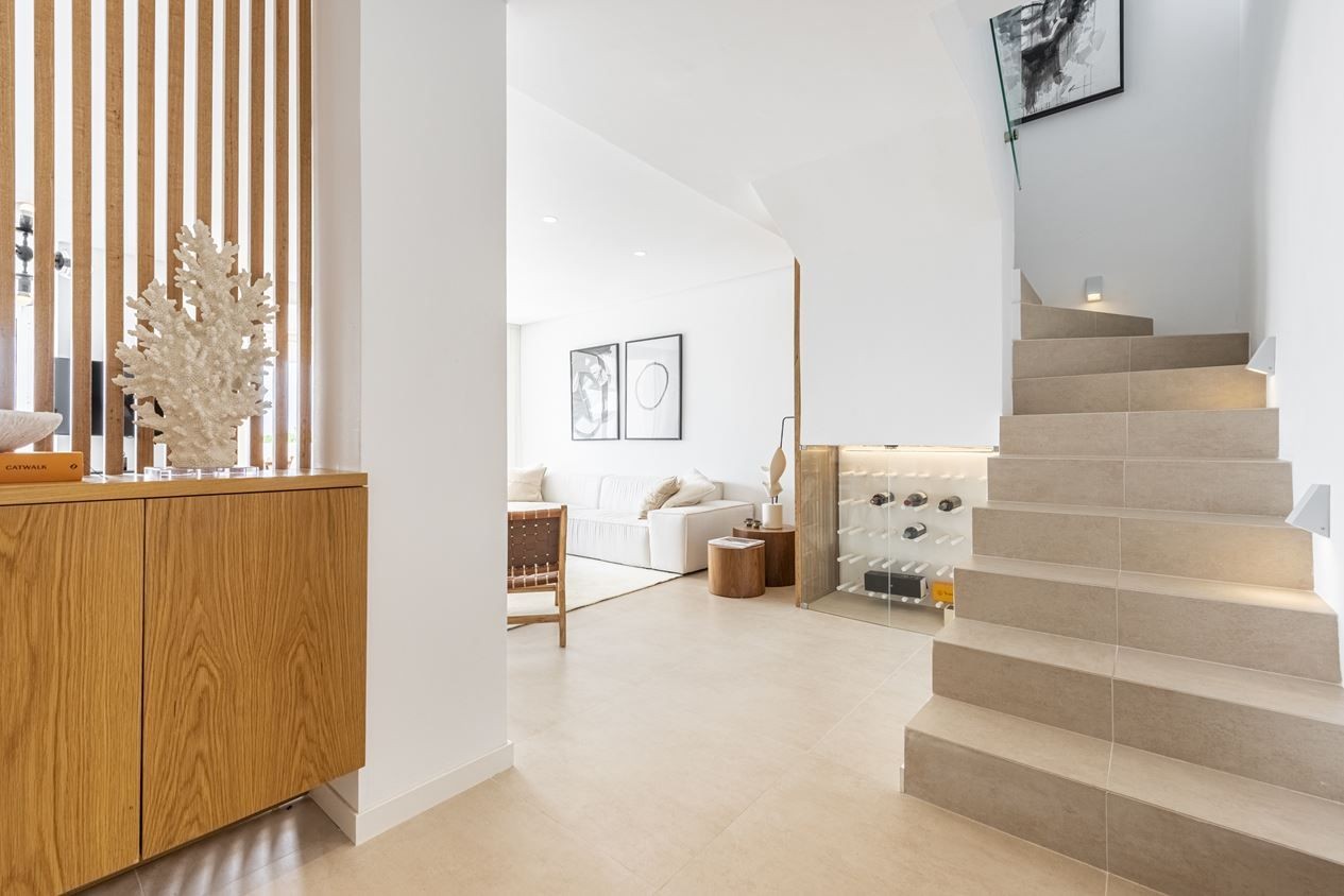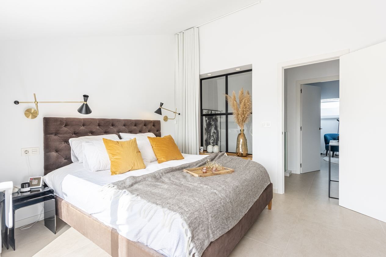 On the entrance level, we have the social areas consisting of an open-plan living room / kitchen, a terrace with a wonderful view, a guest toilet and 1 of the three bedrooms. On the upper floor, we have 2 very tasteful en-suite bedrooms, the master of which has its own private terrace with spectacular views.