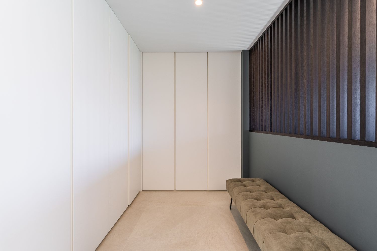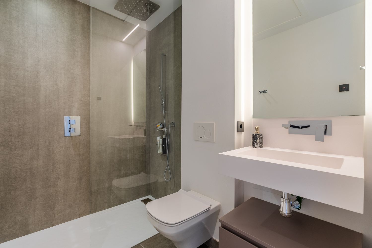 This fabulous 4-level south-facing property of 217 m² boasts a private plot of 22 m², a basement area, a solarium and 28 m² terraces with magnificent views. The exclusive design has optimized the use of natural light thanks to abundance of glass, transparent balustrade panels and large windows with minimal, just 2-cm aluminum frames. The large-format ceramic floor tiles and sophisticated ceiling with LED lighting complement the design. The double-height lounge area is connected to the upper floor