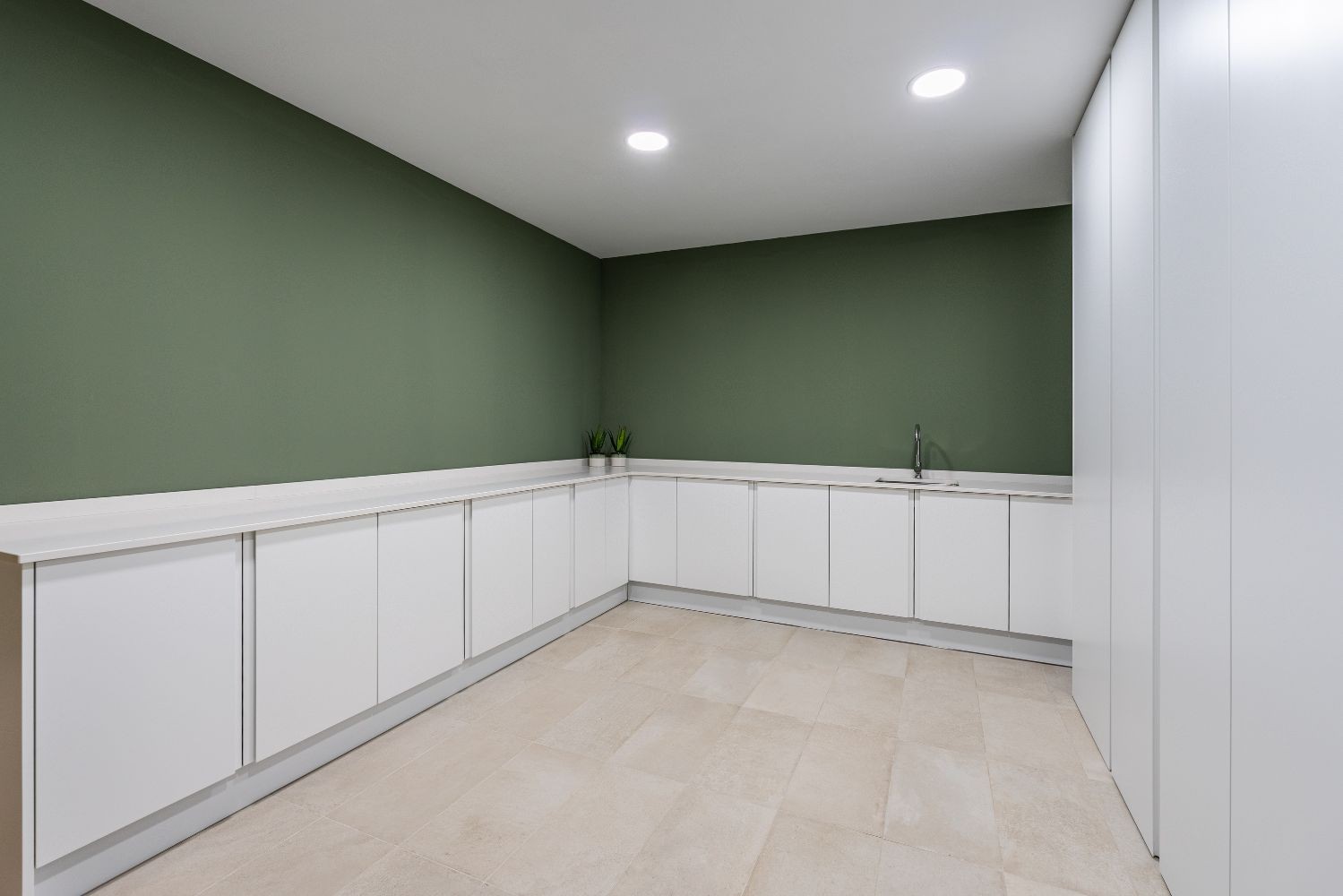 by a modern staircase and glass gallery that enhances the sense of open plan living. The open kitchen with a dining area is sleek and stylish, and superbly equipped with top quality home appliances. The house features 4 bedrooms and 3 bathrooms; the Master bedroom has its own bathroom en-suite. The townhouse has a private roof terrace with Jacuzzi, pergola, decking with barbecue area. The underground garage with automatic door entry has access to the house through an ample laundry and service area. There are communal parking spaces for guests as well.
