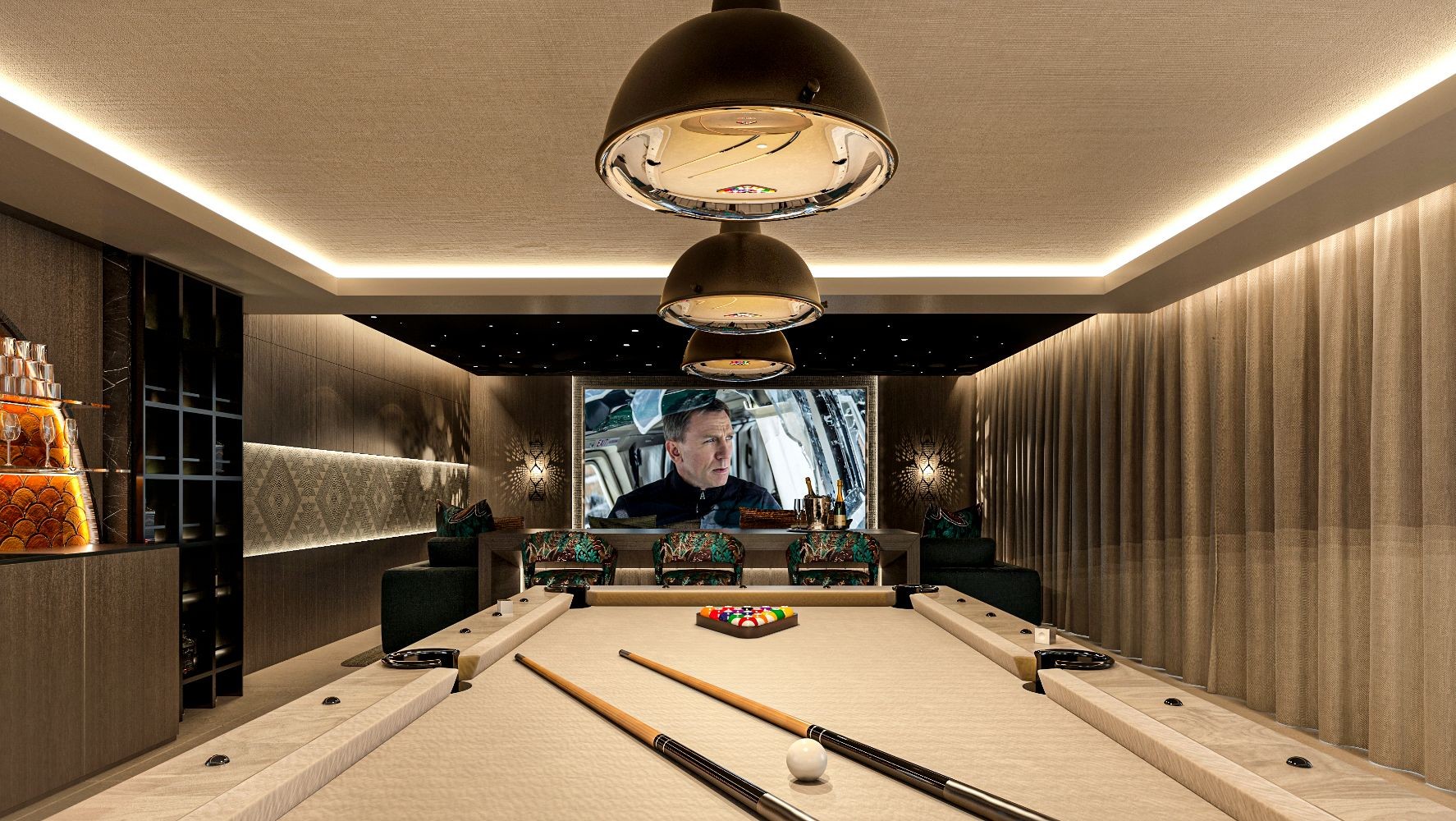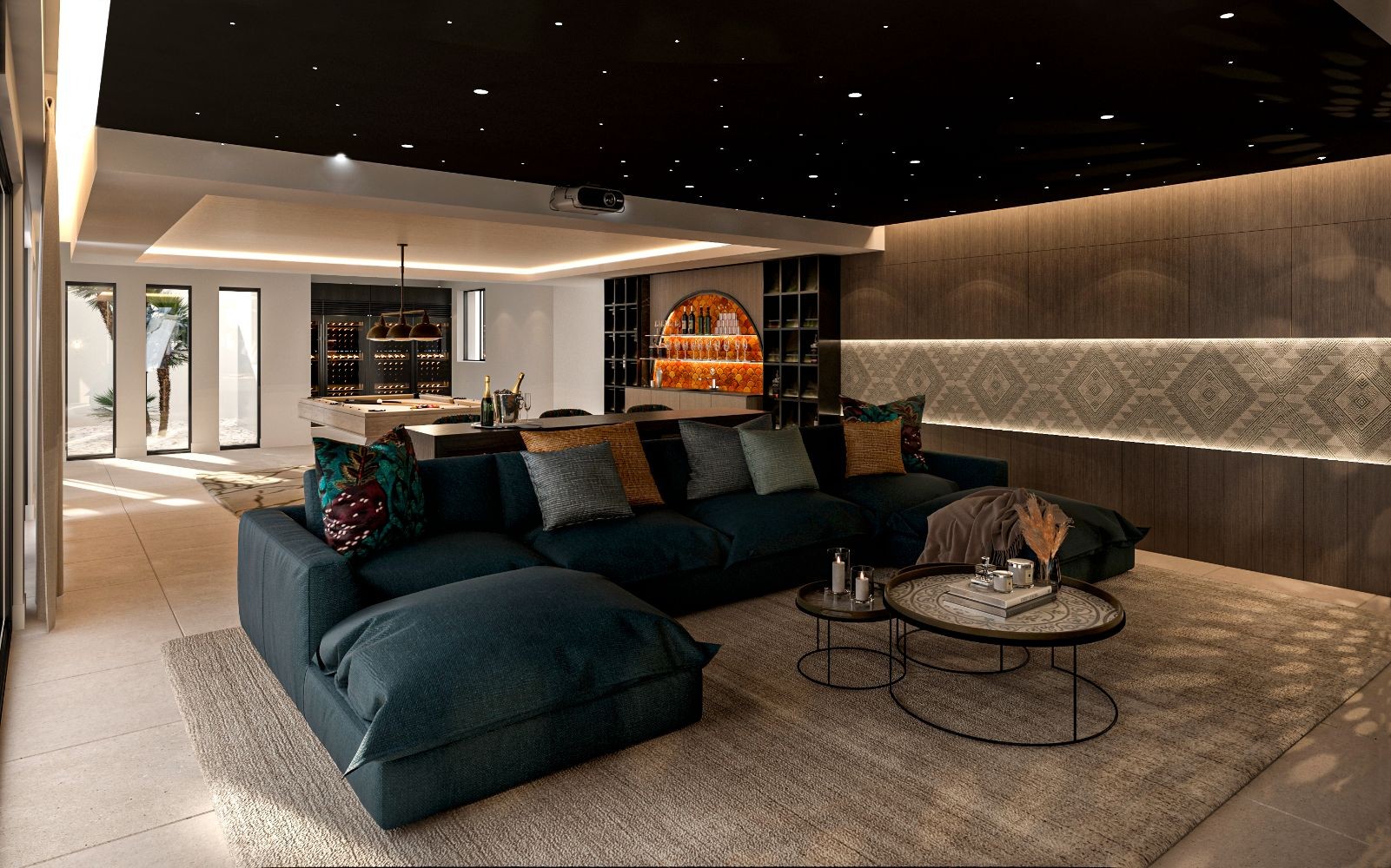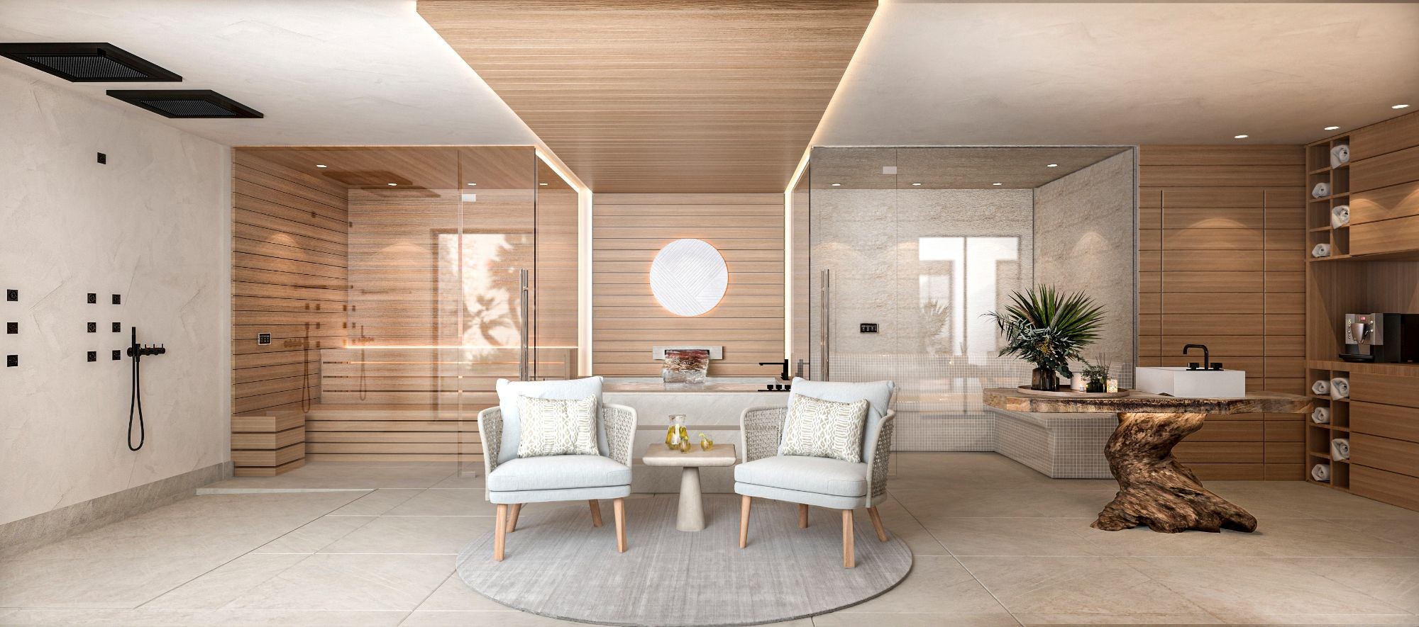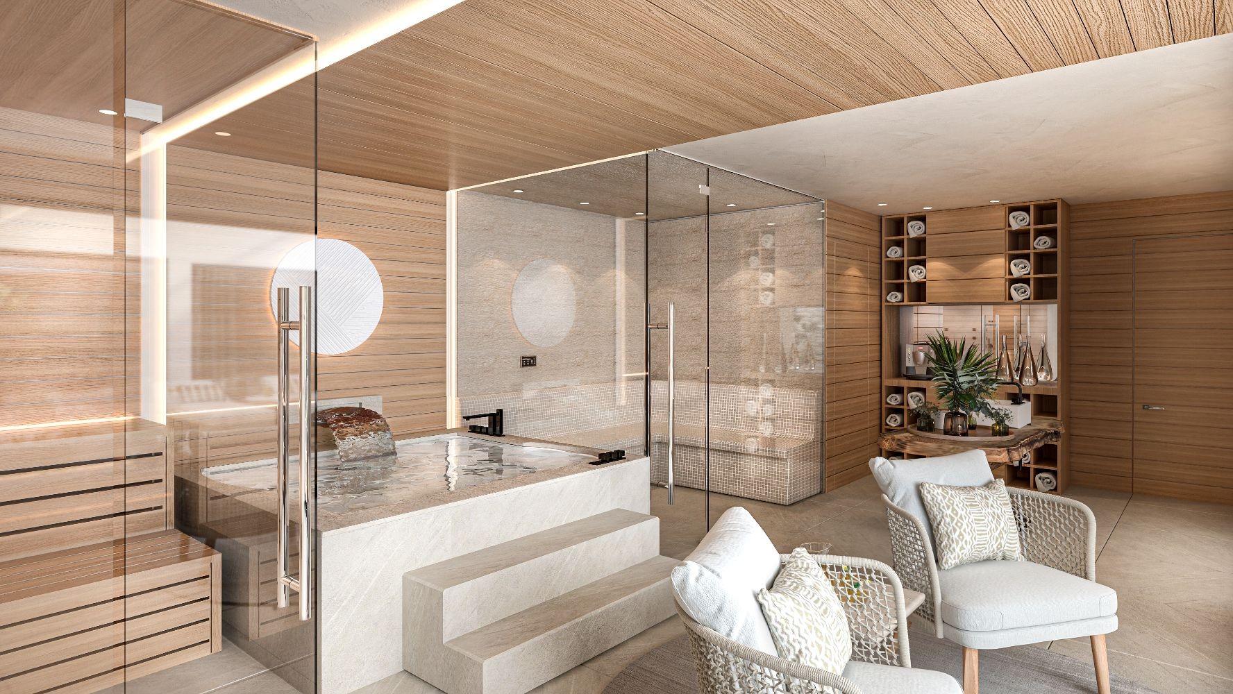 The basement got everything you could wish for, entertaining your family and friends. Coming down the stairs you are immediately welcomed by two interior garden areas with water features, nicely dividing up the spa with sauna and hammam and the large playroom with cinema, wine cellar and bar. Further in the basement you have the fifth bedroom en-suit, a large garage for 3-4 cars, the laundry and technical room.