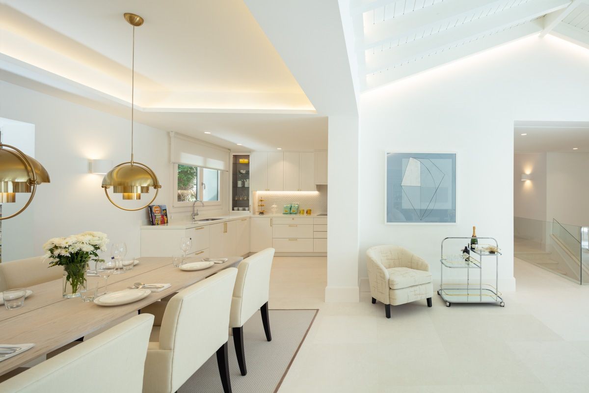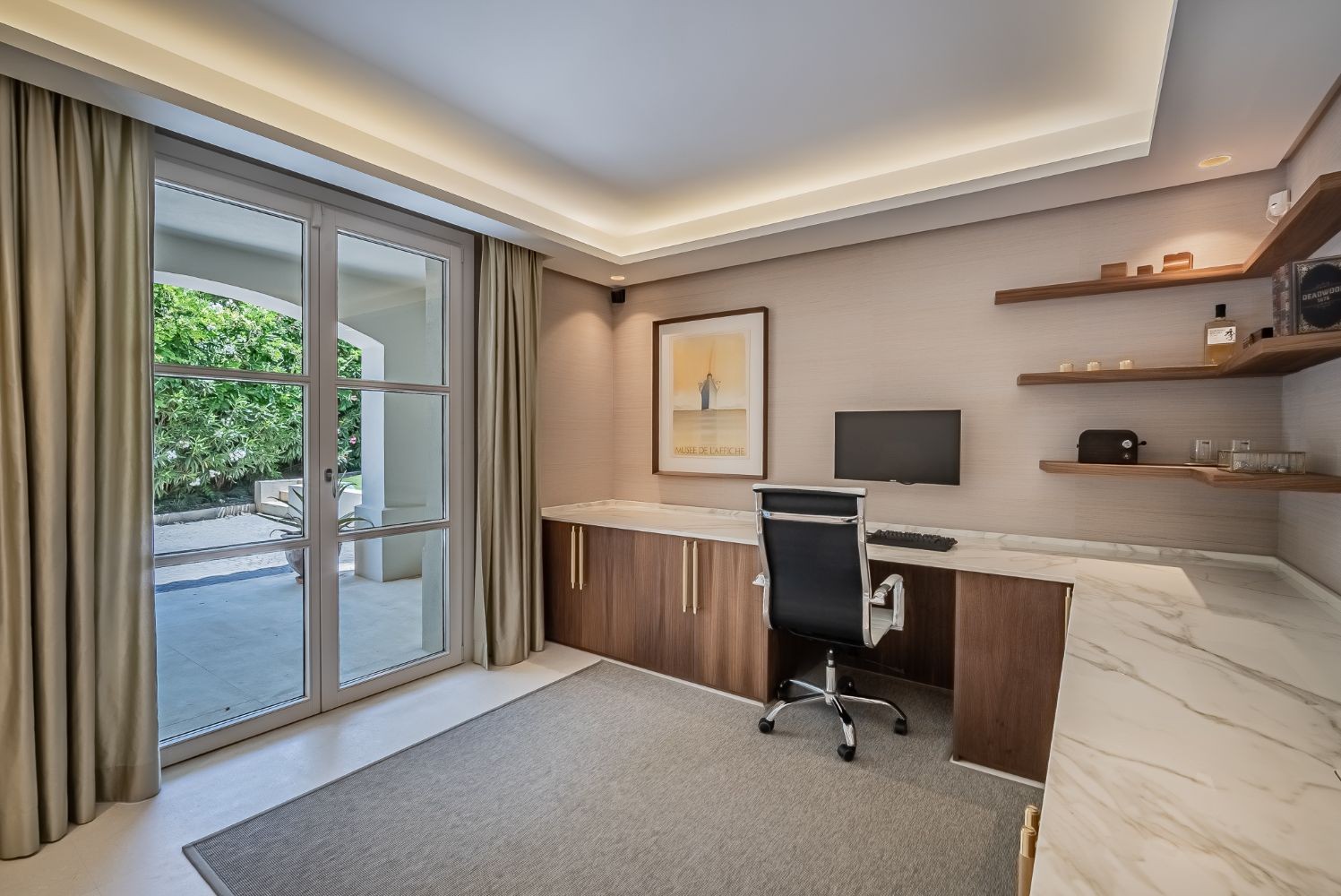 Exquisite villa nestled in the heart of the Golf Valley! A welcoming entry hall leads to the living room with a beautiful pitched roof and stunning fireplace in the center. The open-layout of the home becomes apparent with the merging kitchen & living room space opening up to an entertainers dream backyard with covered porch barbecue area and charming pool area. On this level there are two more bedrooms and the master suite with walk-in closet and views to the pool and La Concha mountain. Downstairs amenities include two convenient bedrooms, laundry room, garage, and a unique second living room / entertainment area styled with wooden floors.