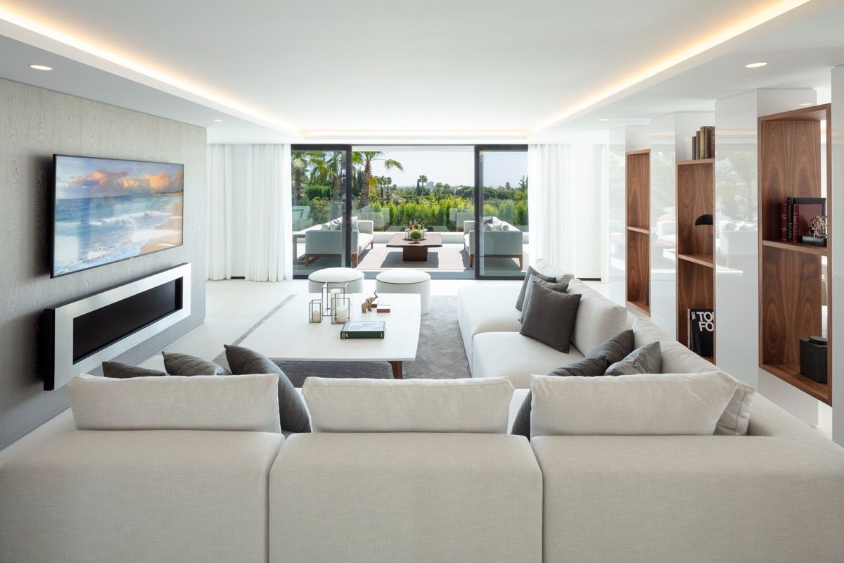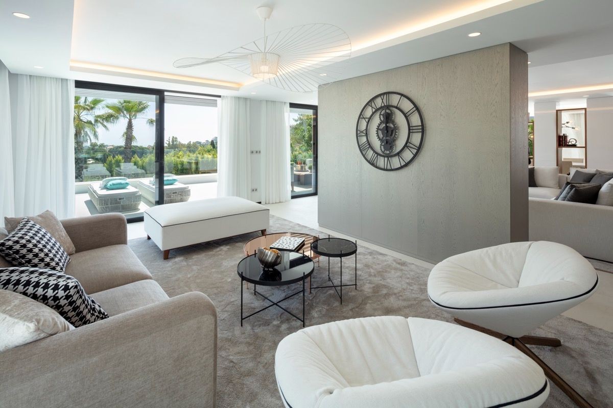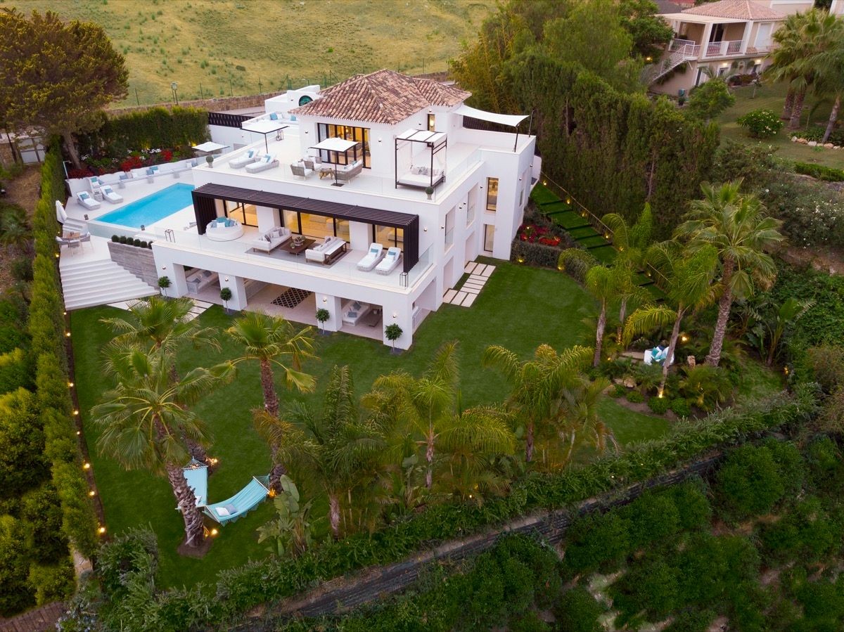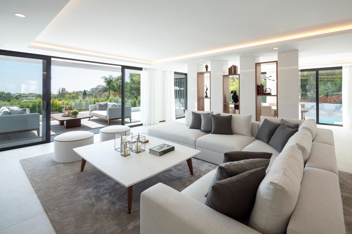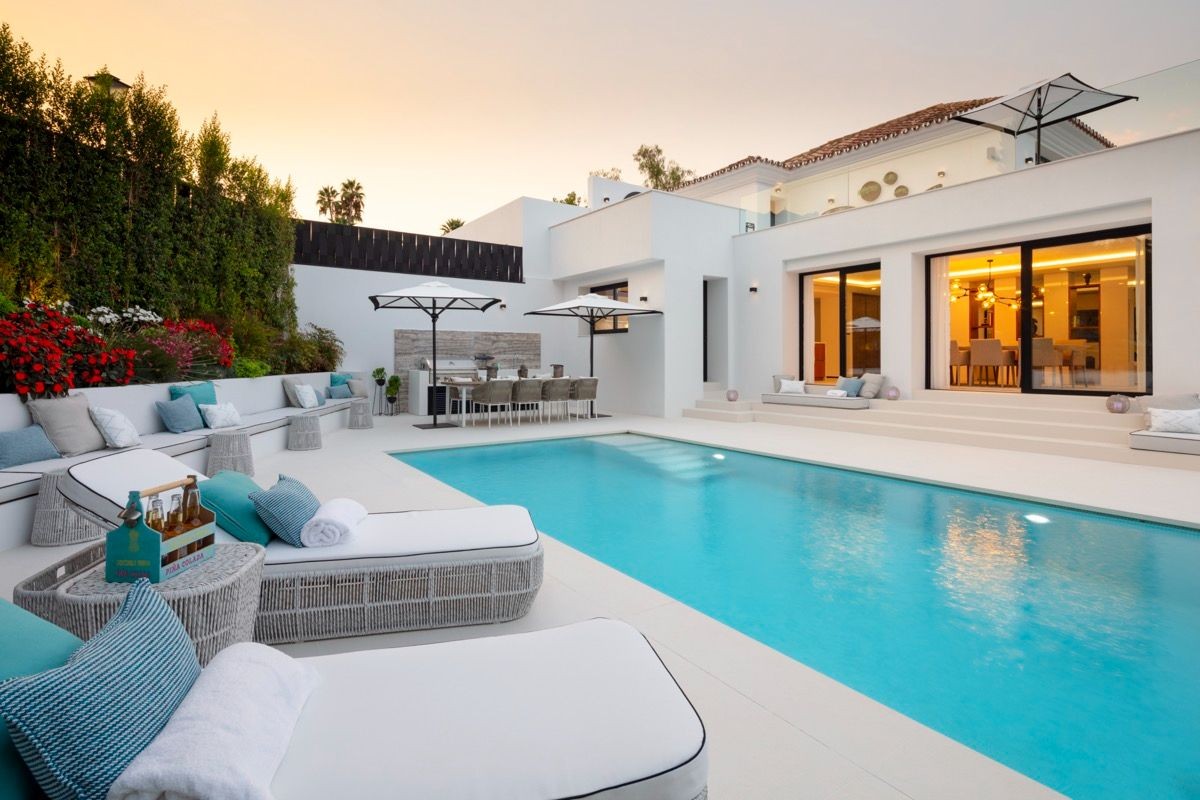 A stunning contemporary villa, residing in the heart of the Golf valley within walking distance to Los Naranjos golf course. A modern and personality infused property, just minutes from 5-Star amenities. The villa is exquisitely furnished and decorated, offering a sensational lifestyle, built with high quality specifications, and its prime location makes this property an ideal home to have in Marbella. Set in a quiet and private street, the villa overlooks the tropical views and the manicured garden, swimming pool area ensuring a peaceful atmosphere to relax and enjoy the amazing weather Marbella offers. The villa welcomes you into an elegant open-plan living room, furnished and decorated with attention to details. This open space enjoys floor-to-ceiling windows that allow plenty of natural light that blends to perfection with the neutral color palette of the furniture. The living room, dining area and kitchen have all access to the expansive covered terrace and manicured garden. The dining area leads to an exquisite custom-made gourmet kitchen, finished to the highest qualities and with high-end appliances. The kitchen overlooks the tropical garden and private swimming pool of the villa. The first floor consists entirely of the lavish master suite, a walk-in closet and complete en-suite bathroom. An expansive terrace wraps around the suite, with beautiful views towards the sea with a built-in gym station. The property also boasts a generous basement with a custom designed bar, lounge and game room and walk-in bodega. A truly stunning home located in one of Marbella’s best locations!