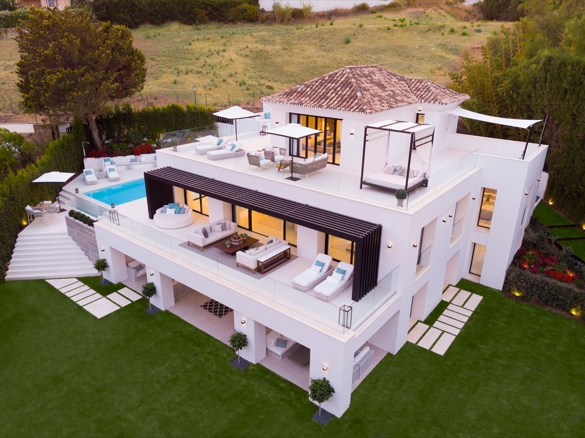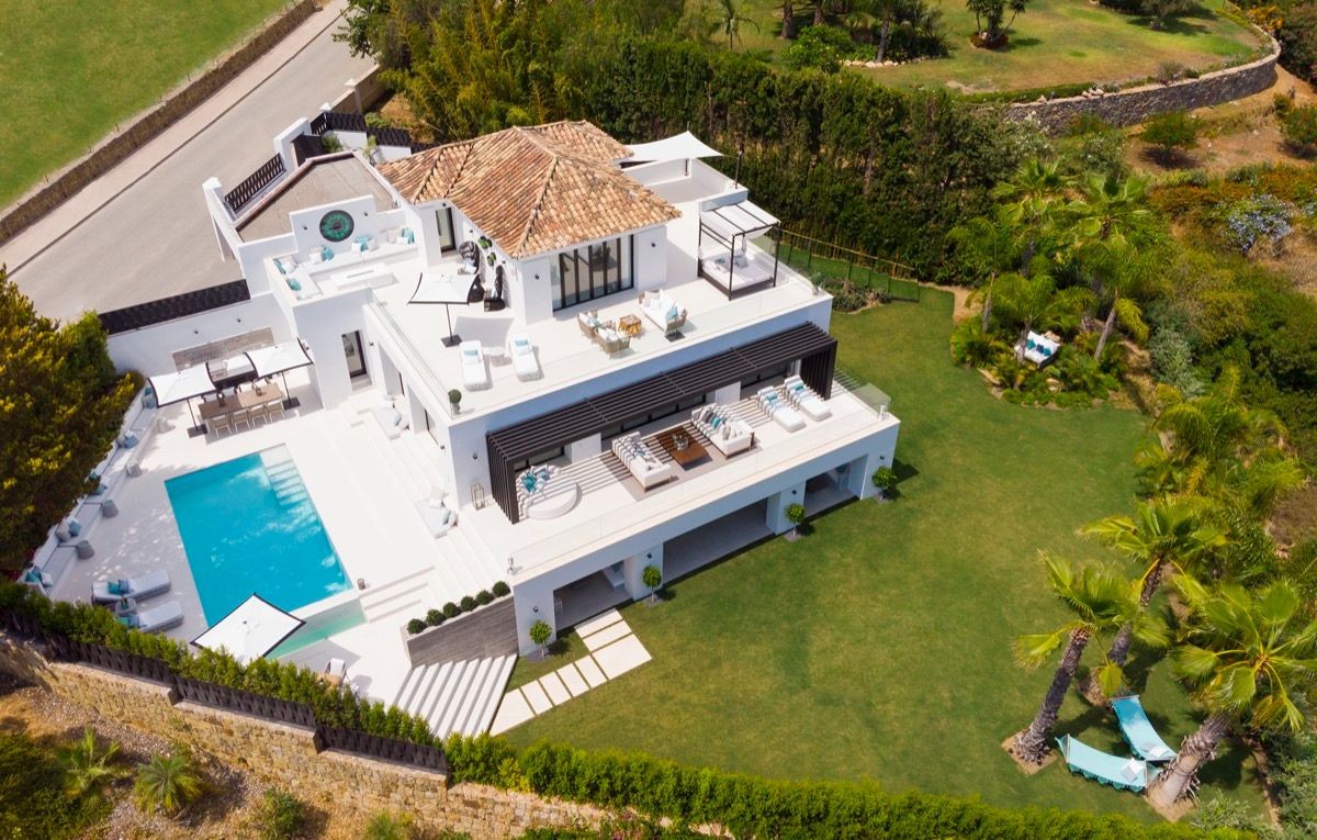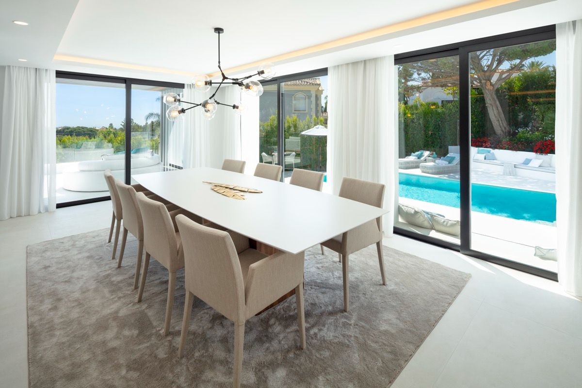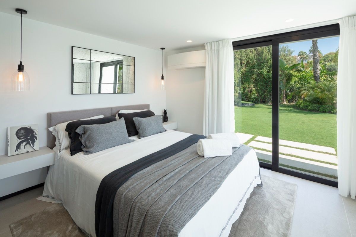 A stunning contemporary villa, residing in the heart of the Golf valley within walking distance to Los Naranjos golf course. A modern and personality infused property, just minutes from 5-Star amenities. The villa is exquisitely furnished and decorated, offering a sensational lifestyle, built with high quality specifications, and its prime location makes this property an ideal home to have in Marbella. Set in a quiet and private street, the villa overlooks the tropical views and the manicured garden, swimming pool area ensuring a peaceful atmosphere to relax and enjoy the amazing weather Marbella offers. The villa welcomes you into an elegant open-plan living room, furnished and decorated with attention to details. This open space enjoys floor-to-ceiling windows that allow plenty of natural light that blends to perfection with the neutral color palette of the furniture. The living room, dining area and kitchen have all access to the expansive covered terrace and manicured garden. The dining area leads to an exquisite custom-made gourmet kitchen, finished to the highest qualities and with high-end appliances. The kitchen overlooks the tropical garden and private swimming pool of the villa. The first floor consists entirely of the lavish master suite, a walk-in closet and complete en-suite bathroom. An expansive terrace wraps around the suite, with beautiful views towards the sea with a built-in gym station. The property also boasts a generous basement with a custom designed bar, lounge and game room and walk-in bodega. A truly stunning home located in one of Marbella’s best locations!
