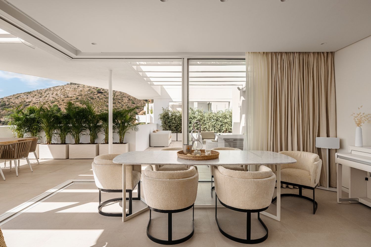 Surrounded with idyllic Andalusian nature and similar high-end properties, the south-facing modern style duplex has been created to the highest specifications. Offering its residents utmost comfort and functionality, it features an open plan living room, dining area and sleek fully fitted kitchen with an island, 3 serene bedrooms, 3 modern bathrooms and a guest toilet. The glass doors let in the sun and natural light and provide a seamless connection between the rooms and terraces. The private, sunny and covered terraces and solarium invite to enjoy the spectacular panoramic vistas and the Costa del Sol warm and mild climate. The luxury property features also benefits from 3 parking spaces in a garage and a storage room.