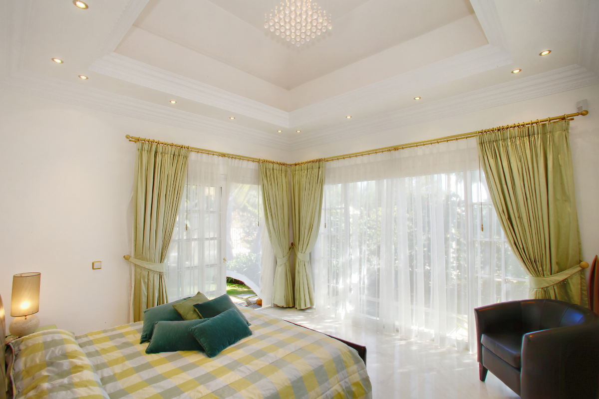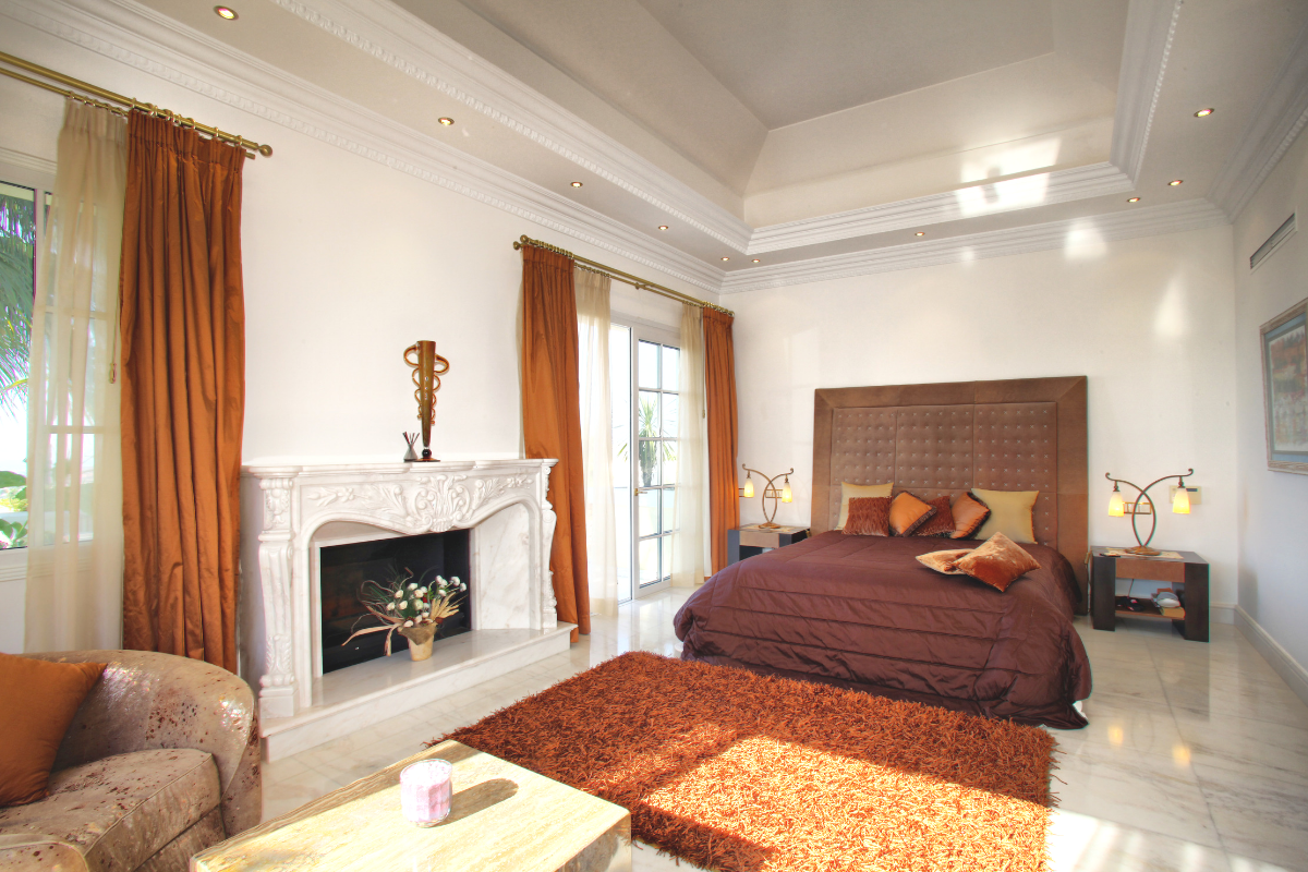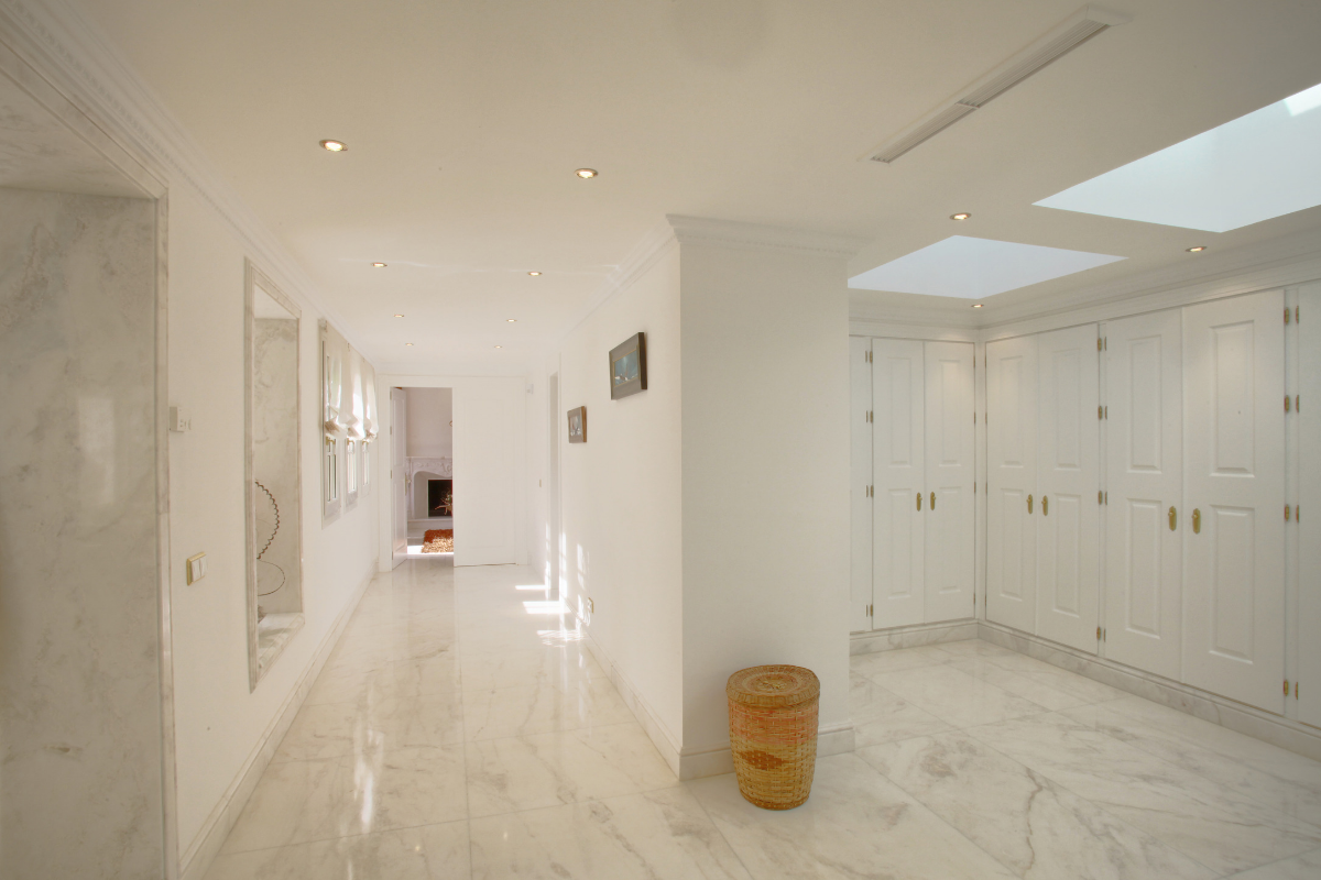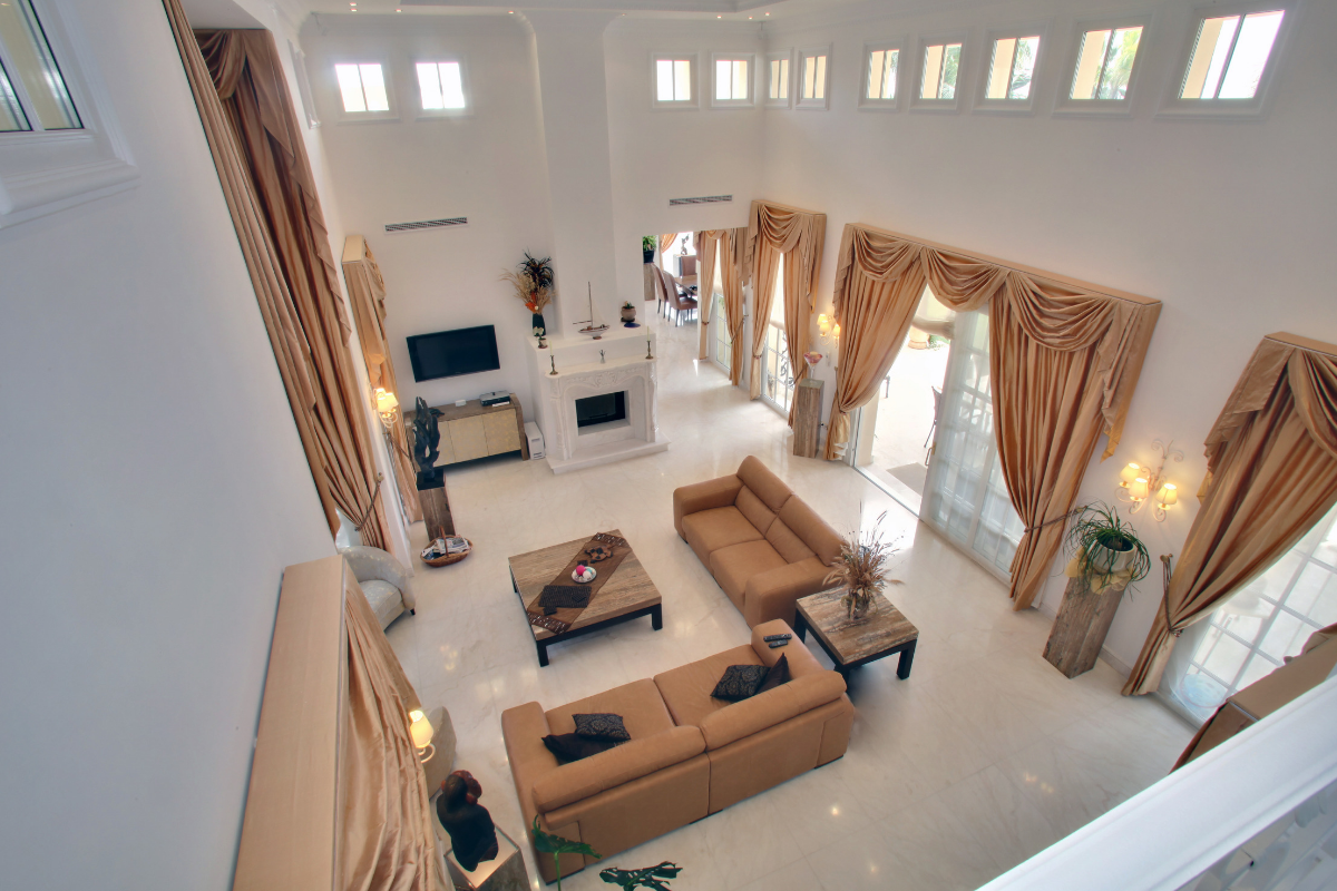 The interior decoration of this house is extremely high including Italian silk curtains throughout and the very best furniture materials. Inside, on the ground floor the property offers a large lounge with triple height ceiling opening onto the covered main terrace, garden and pool with sea view, a grand dining room with vaulted ceiling and candelabra feature, 2 fully equipped kitchen areas including chef/party catering and breakfast area, 2 guest bathrooms, and three en-suite double bedrooms with dressing areas, as well as the impressive entrance hall and staircase with interior palm trees.