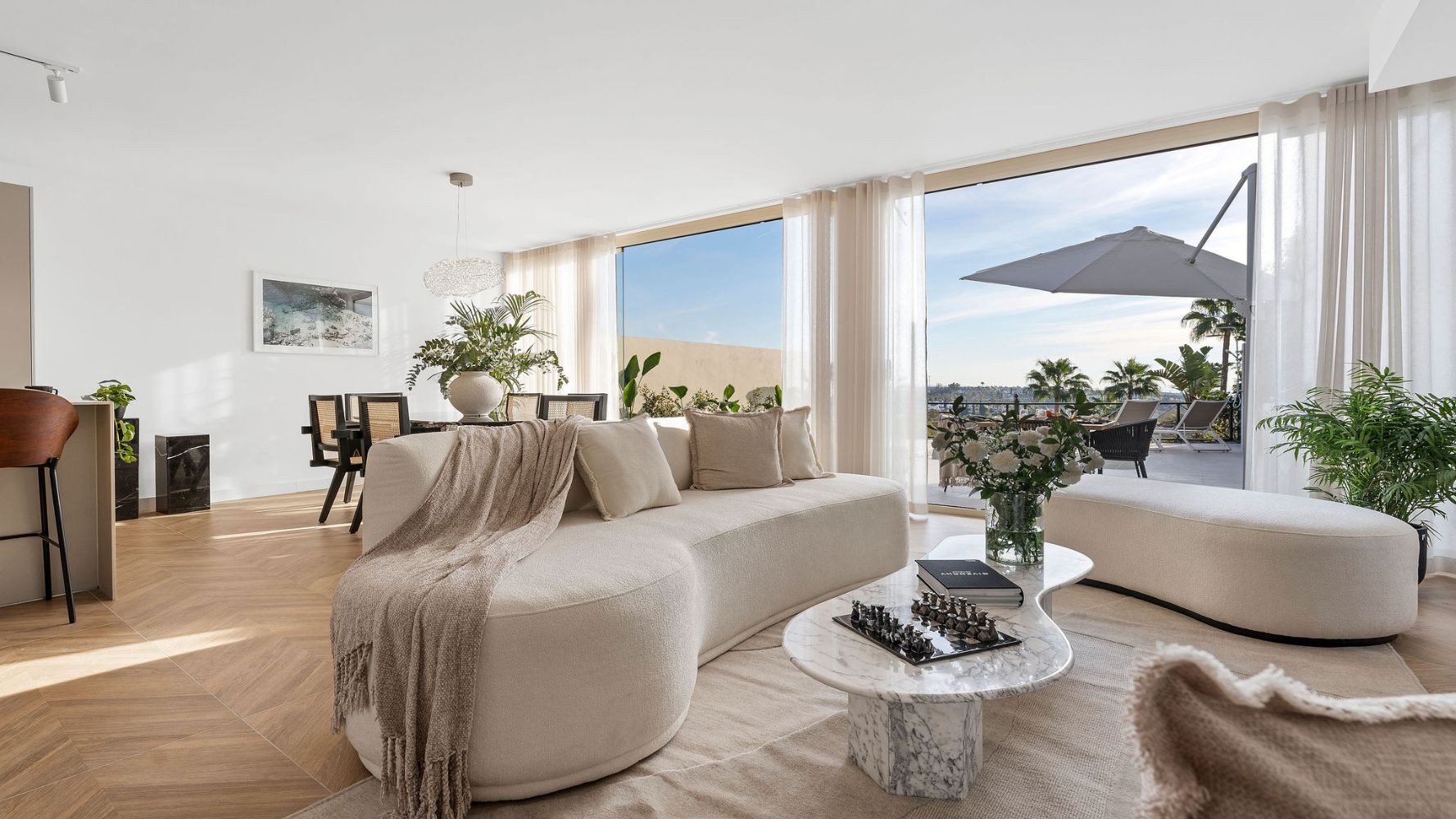 A luxurious four-bedroom apartment with a private pool and garden, offering stunning sea and mountain views. This renovated ground-floor apartment is a haven of modern, Parisian style living in the heart of Nueva Andalucia, La Cerquilla.