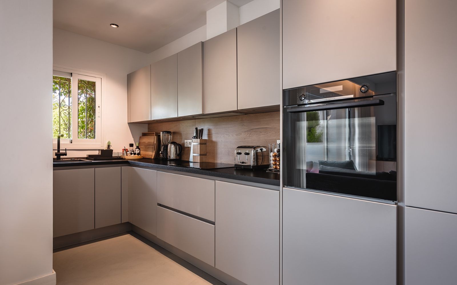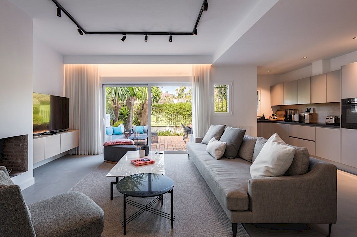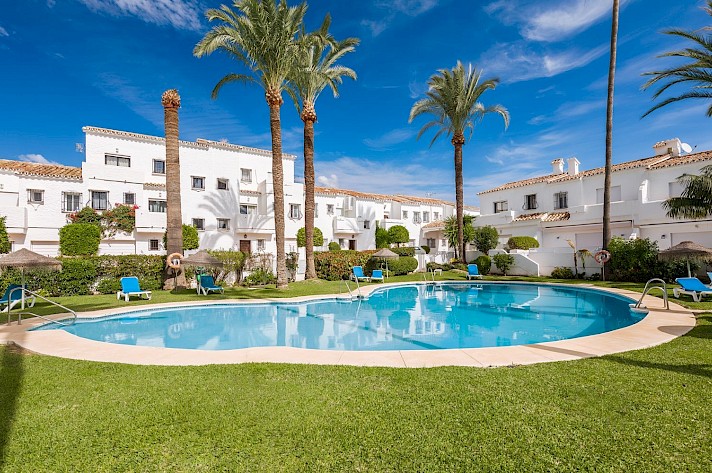 Charming frontline golf townhouse situated in a sought after secure development in Las Brisas/ Nueva Andalucia. The property has been recently refurbished and on the ground level consists of an open plan living, dining area and fully fitted kitchen, with access to a good size terrace with stunning views over the golf course and the mountains. On this level there is also a double bedroom and a guest toilet. On the upper level there is the spacious master bedroom suite with fitted wardrobes and access to a good size terrace with golf views and a further guest bedroom with en suite bathroom and fitted wardrobes.