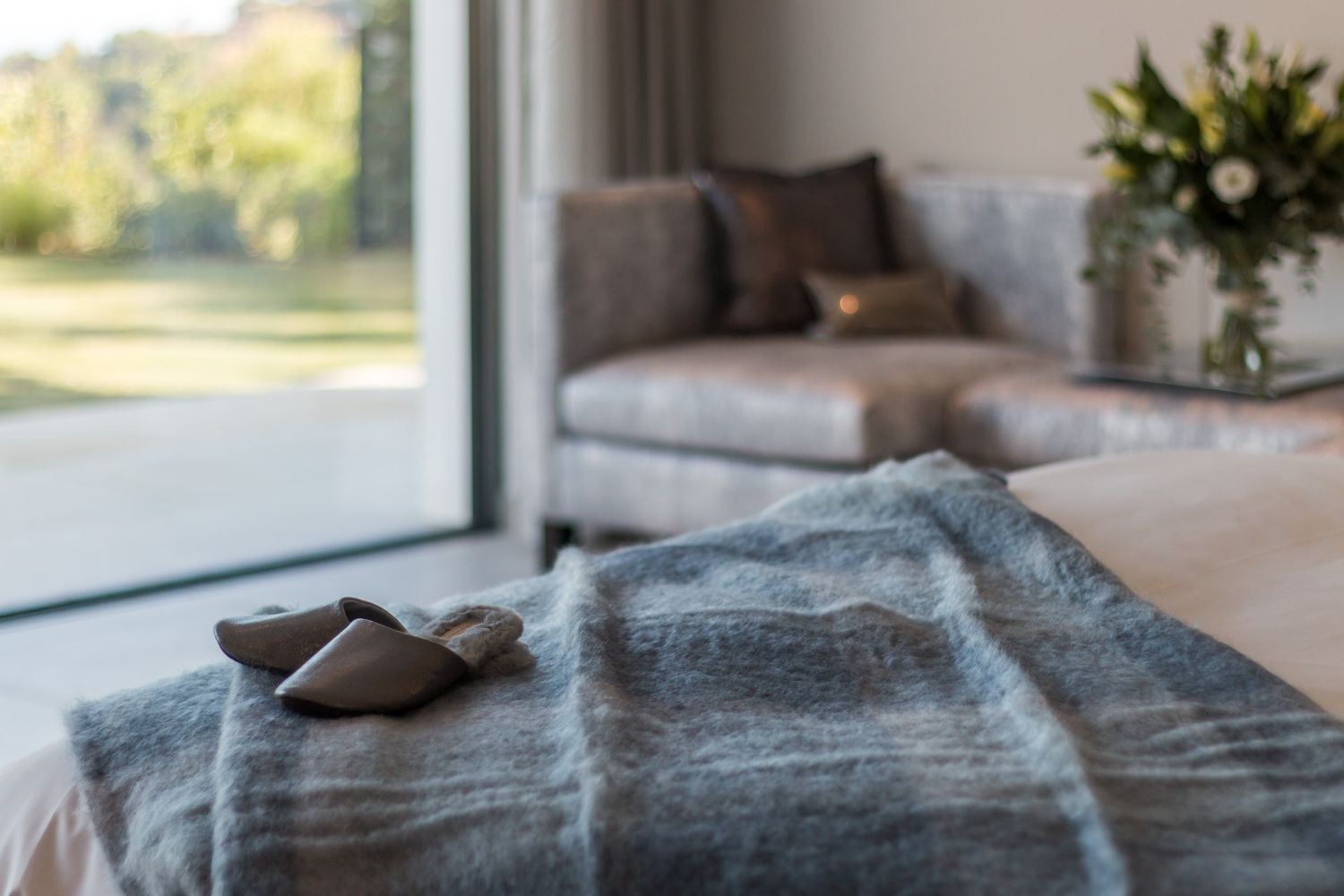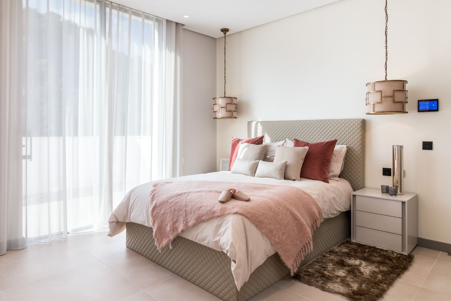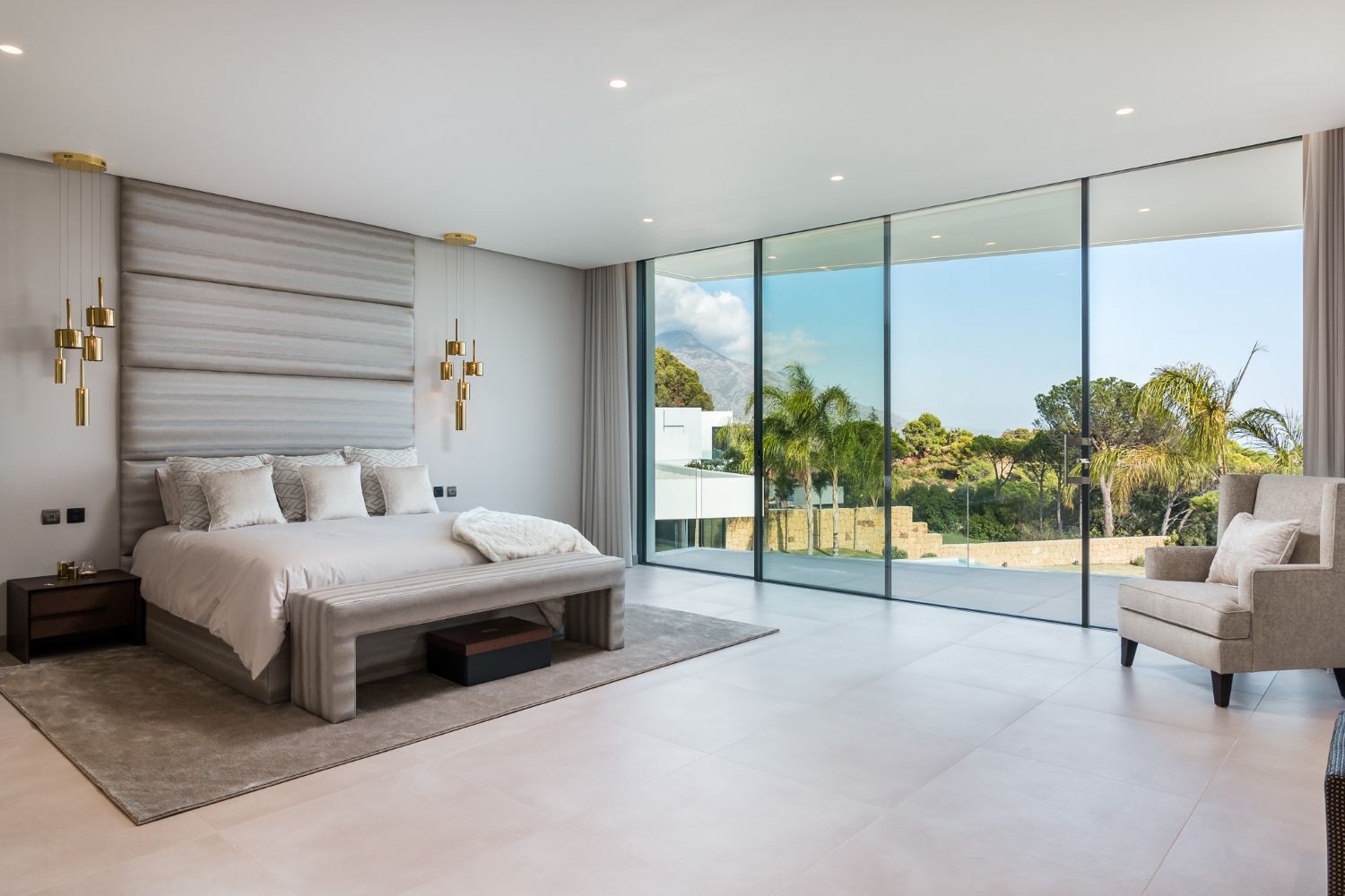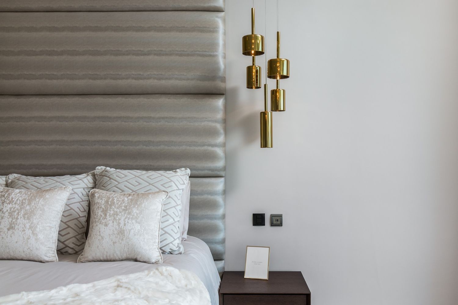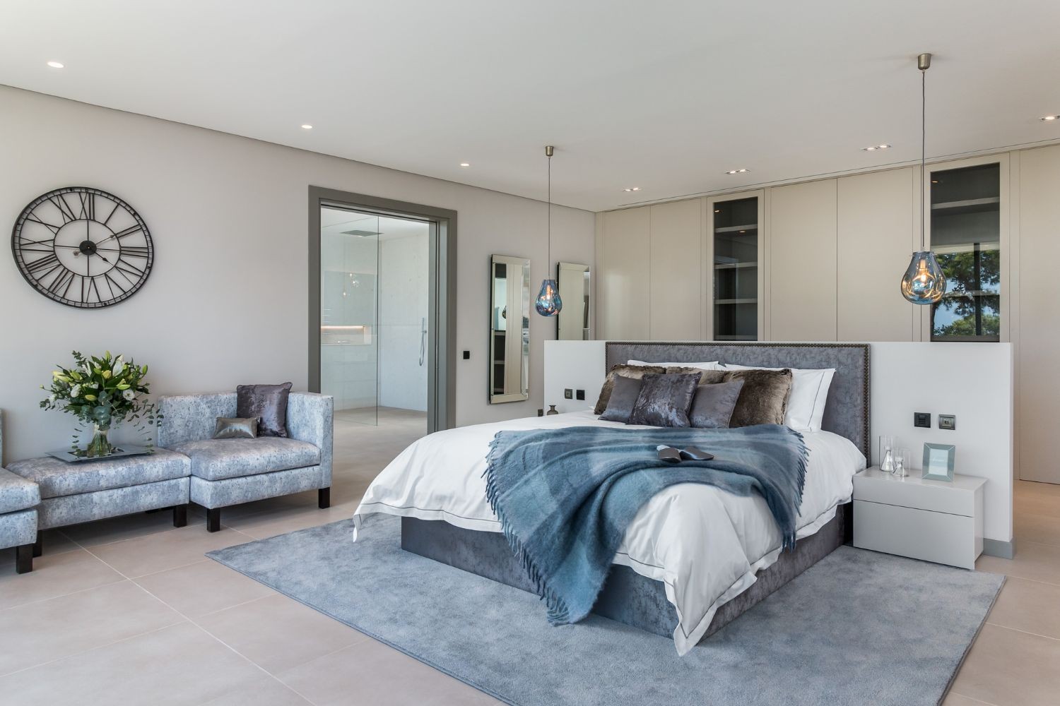 appear to float out of the wall and the glass balustrade allows views across the immense entrance space. Upstairs are two more ensuite guest bedrooms and the other en-suite master bedroom. Mixing gold and beige the second master bedroom is a nod to