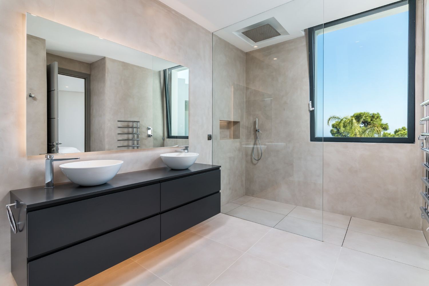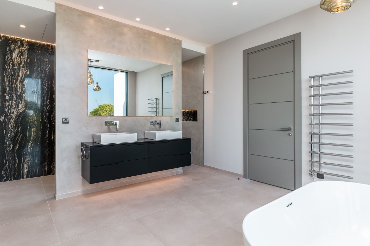 midcentury-modern thanks to the incredible wardrobe carpentry and sensor lighting as you open the doors. The bathroom layout is