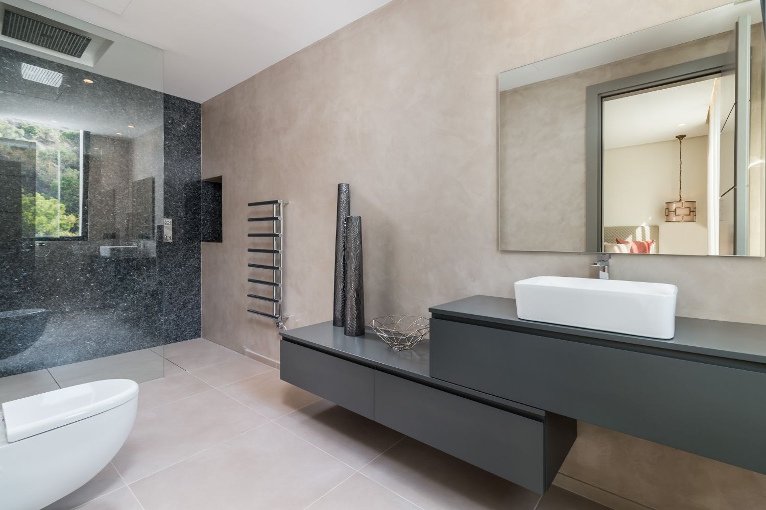 open yet private, with his and her wall hung sink unit behind which is a toilet and a shower, both finished with the most stunning
