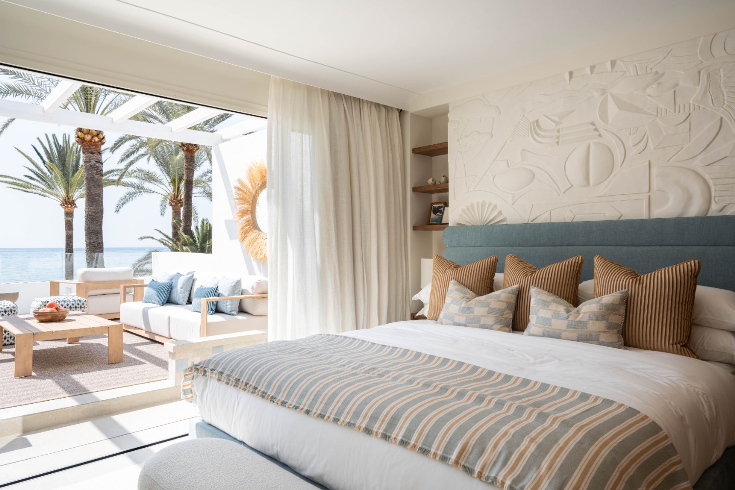 Upstairs, you’ll find two additional bedroom suites, each boasting panoramic sea views. The principal suite evokes a serene Mediterranean atmosphere, featuring an elegant en-suite bathroom and a chic walk-in dressing room. The second suite opens onto a generous terrace with a lounge area and wet bar—an idyllic spot to enjoy Marbella’s golden sunsets.