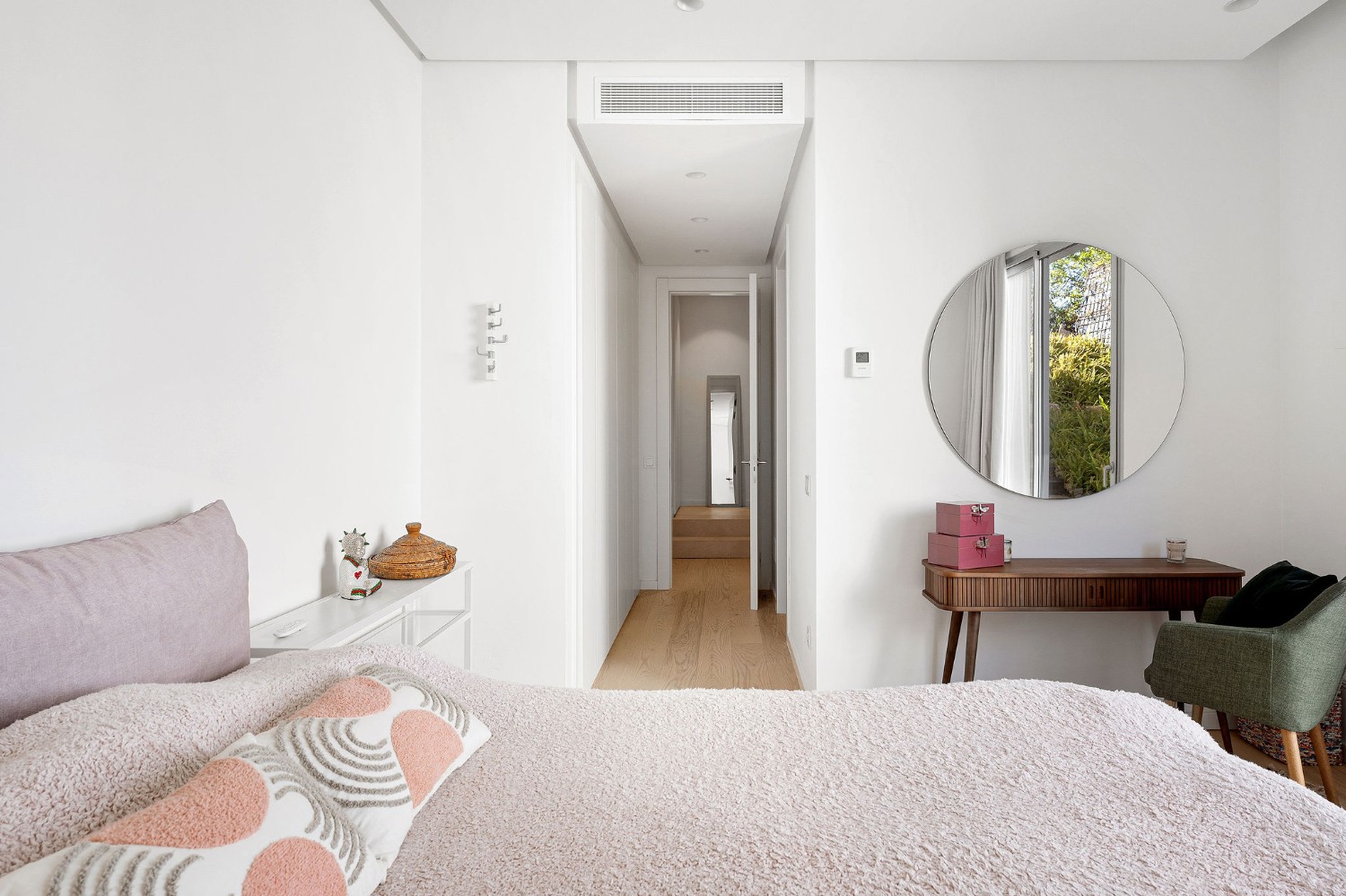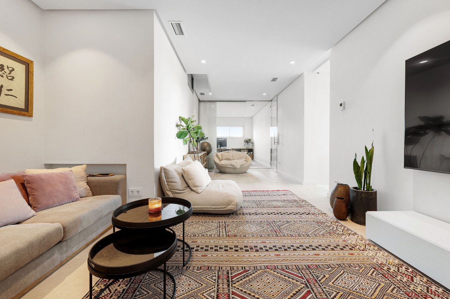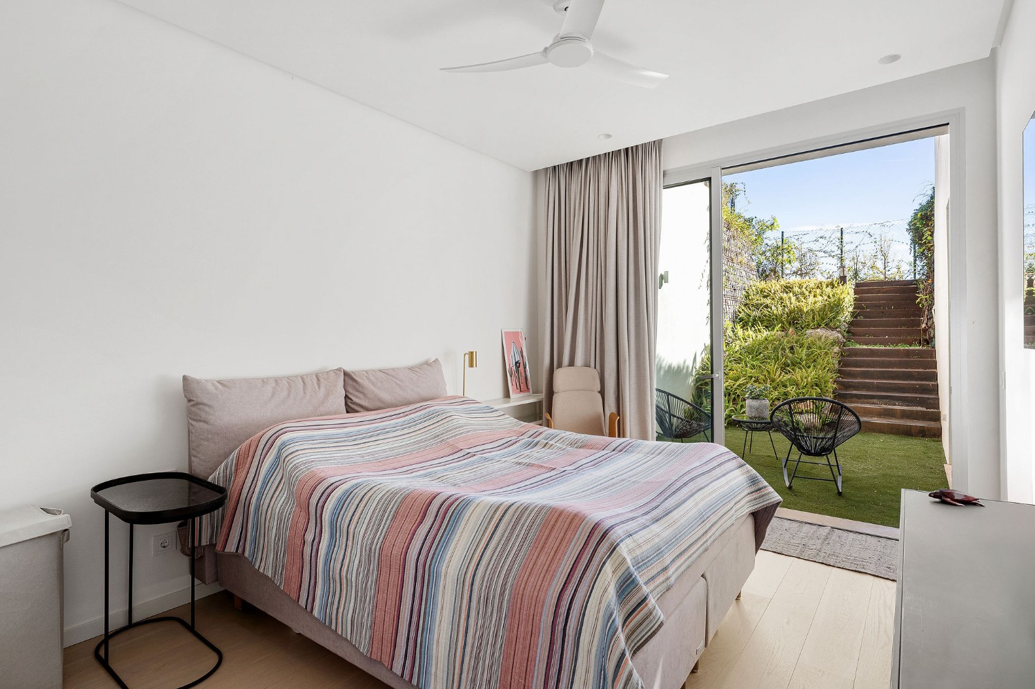 The main level features an open-concept kitchen and a bright living–dining area with large sliding doors that open onto the private terraces and garden. On this floor you will also find the master suite, which benefits from an additional 40 m² extension created from the original design—currently used as a cosy TV room and home office.