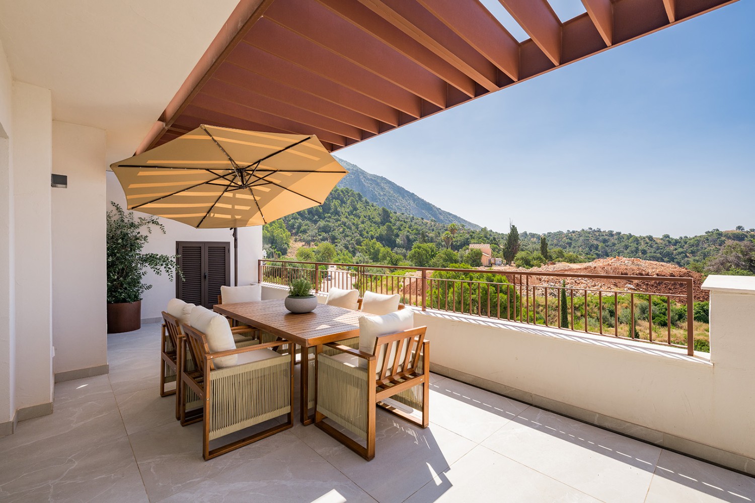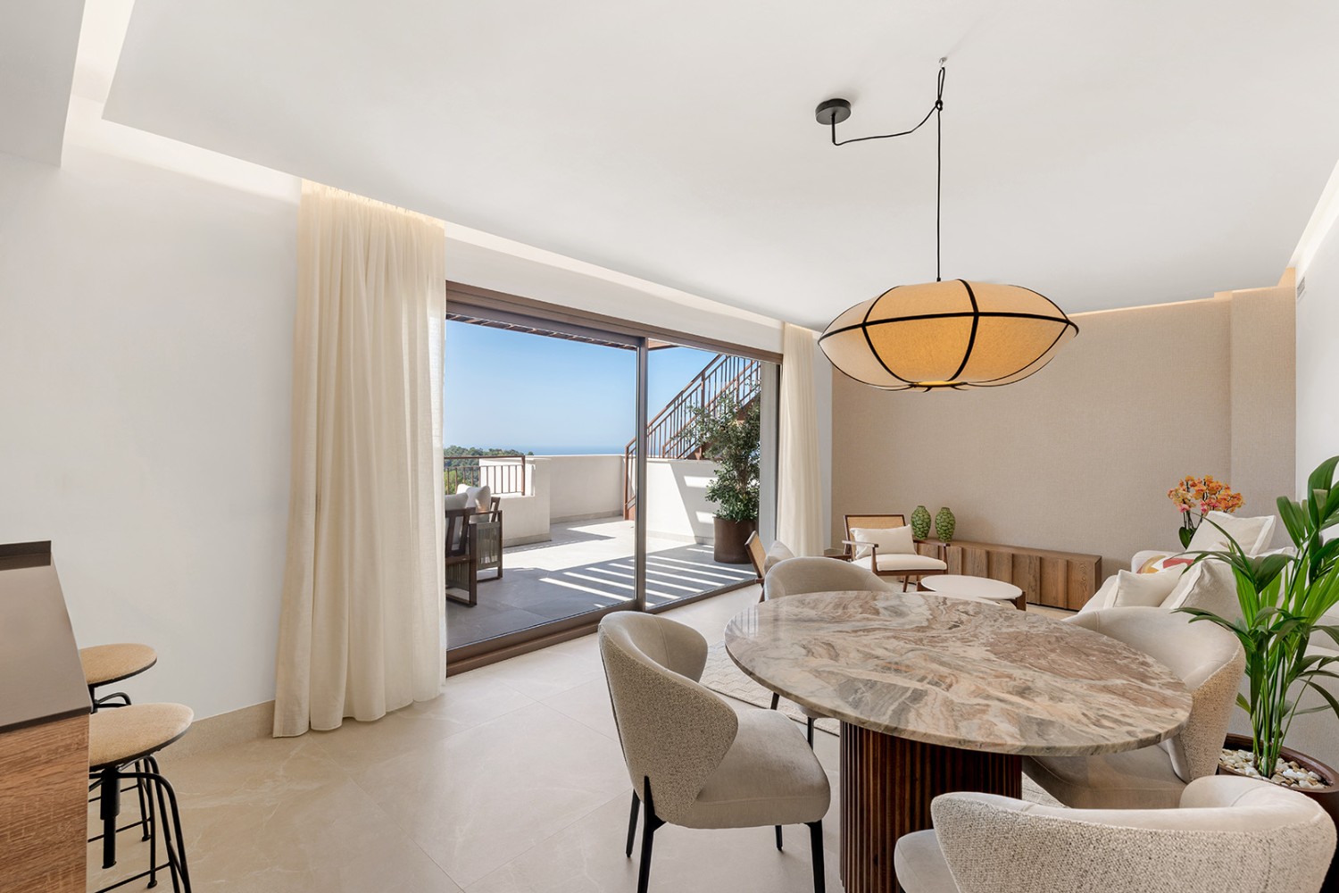 Discover this exceptional 3-bedroom duplex penthouse set within a private enclave nestled in the hills above Marbella, just five minutes from the renowned Golden Mile. Beautifully designed by acclaimed interior designer Marta del Ganso—the creative force behind Breathe Marbella—the residence blends refined contemporary elegance with warm, organic textures that echo its natural surroundings. Set in an elevated position in the foothills of the Sierra de las Nieves, the property enjoys panoramic views of both the Mediterranean Sea and the mountains, creating a serene and sophisticated atmosphere. The gated community offers privacy and security, complemented by landscaped gardens, communal swimming pools, and contemporary architecture with high-quality, energy-efficient finishes. Expansive terraces maximize natural light and outdoor living, while the surrounding area provides access to nature trails without sacrificing proximity to Marbella’s vibrant lifestyle. The penthouse itself boasts breathtaking dual-aspect views and generous indoor-outdoor spaces designed for both relaxation and entertaining, offering the perfect balance between tranquil living and the dynamic energy of the Costa del Sol.