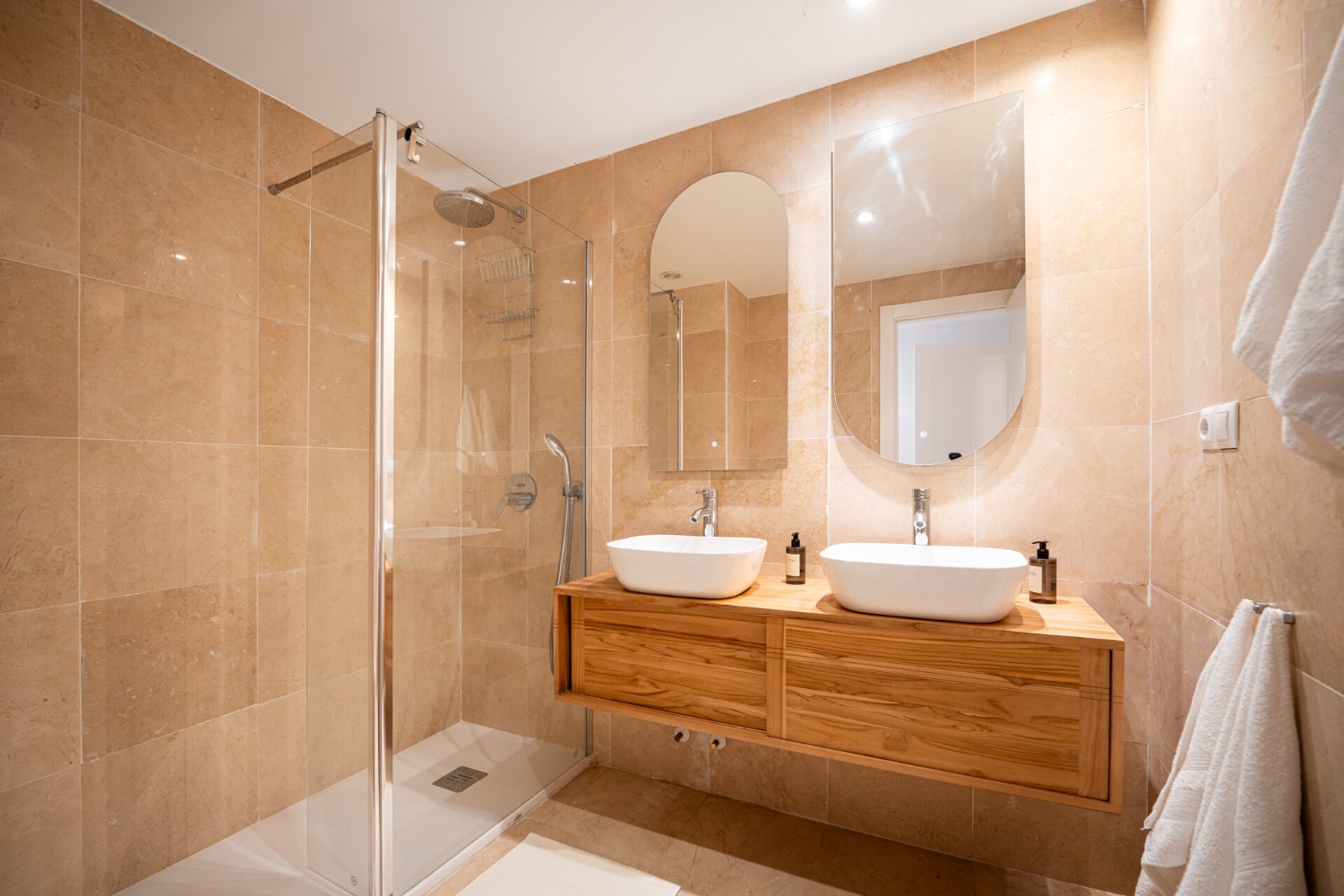 The bright, open-plan living area seamlessly connects the modern kitchen, dining, and lounge spaces. A cosy fireplace adds a touch of warmth and character, while large sliding doors open onto the terrace—ideal for alfresco dining or simply relaxing with the view. Each bedroom is generously sized and bathed in natural light, featuring built-in wardrobes for ample storage. The bathrooms showcase contemporary design, with walk-in rain showers and elegant wooden vanities.