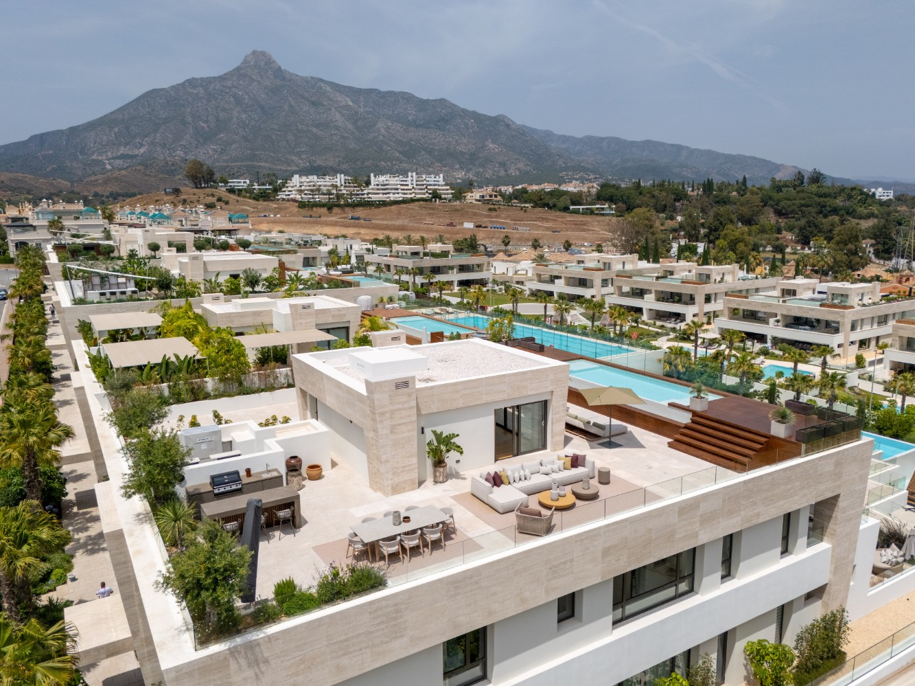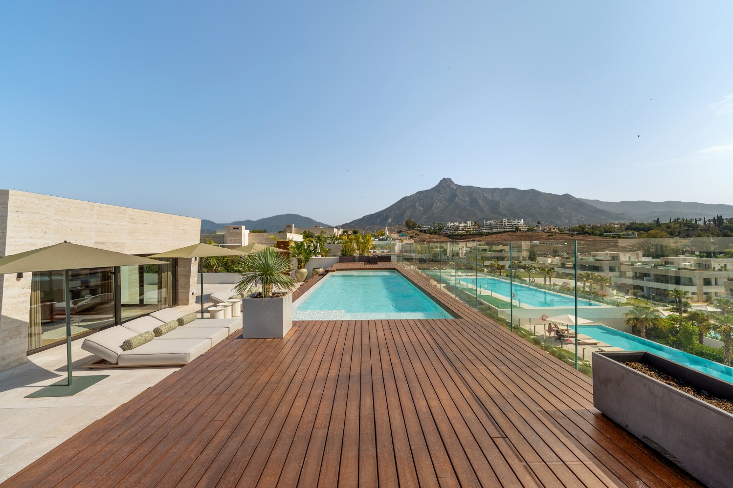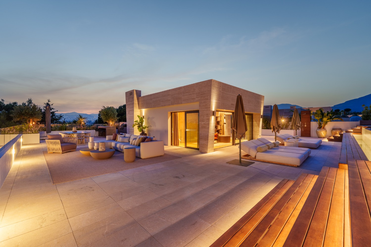 High-quality carpentry and sweeping panoramic views from the main floor terraces and solarium further elevate the living experience. Upstairs, a private swimming pool provides a secluded oasis, with the added option to install a bar or barbecue area for the ultimate in leisure and entertainment.