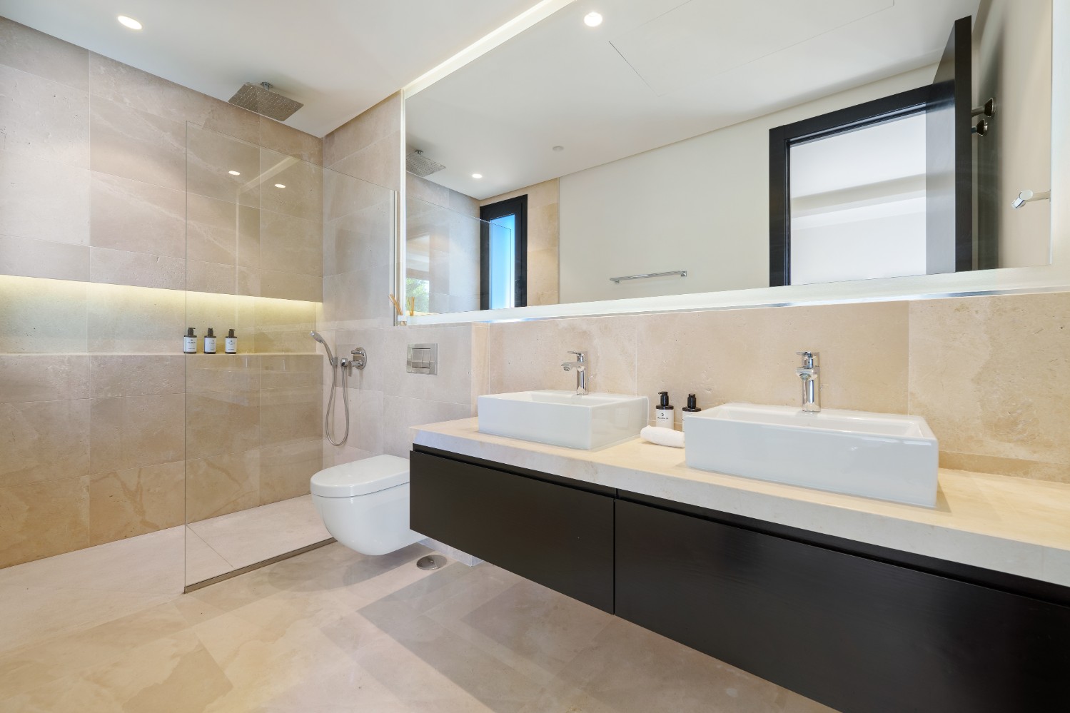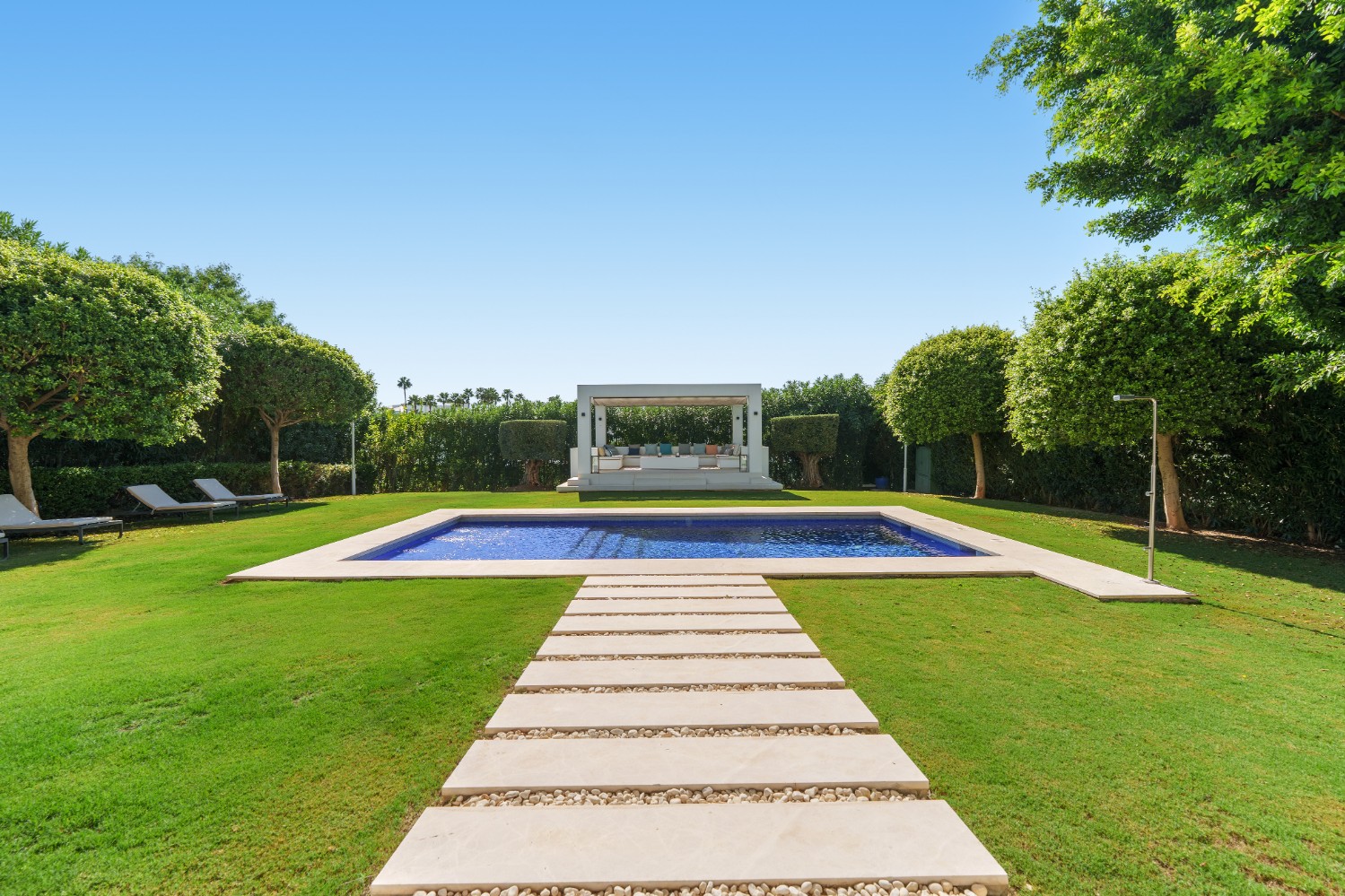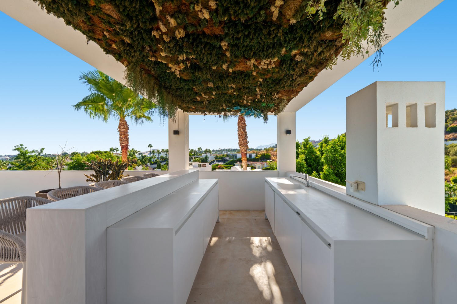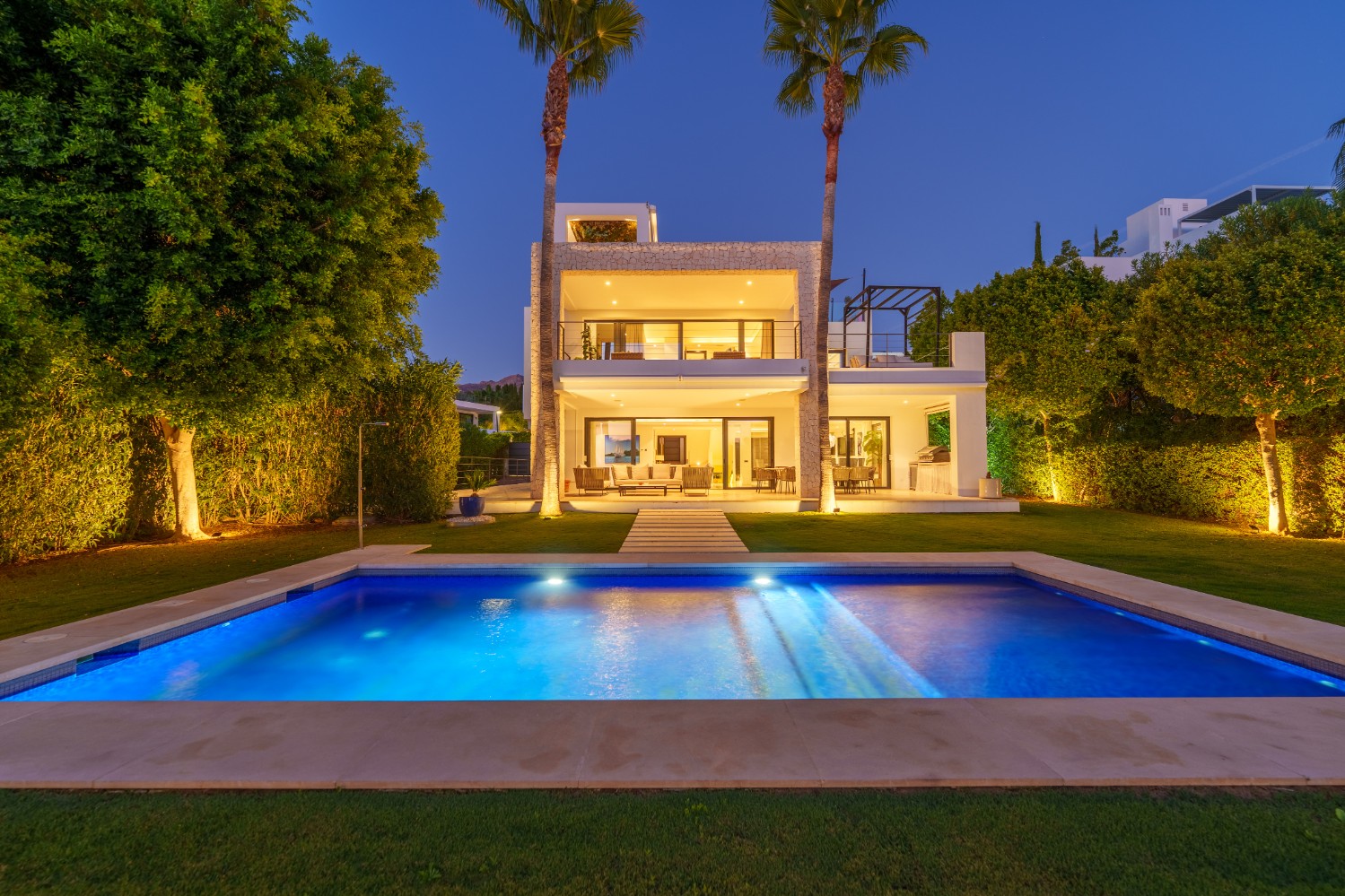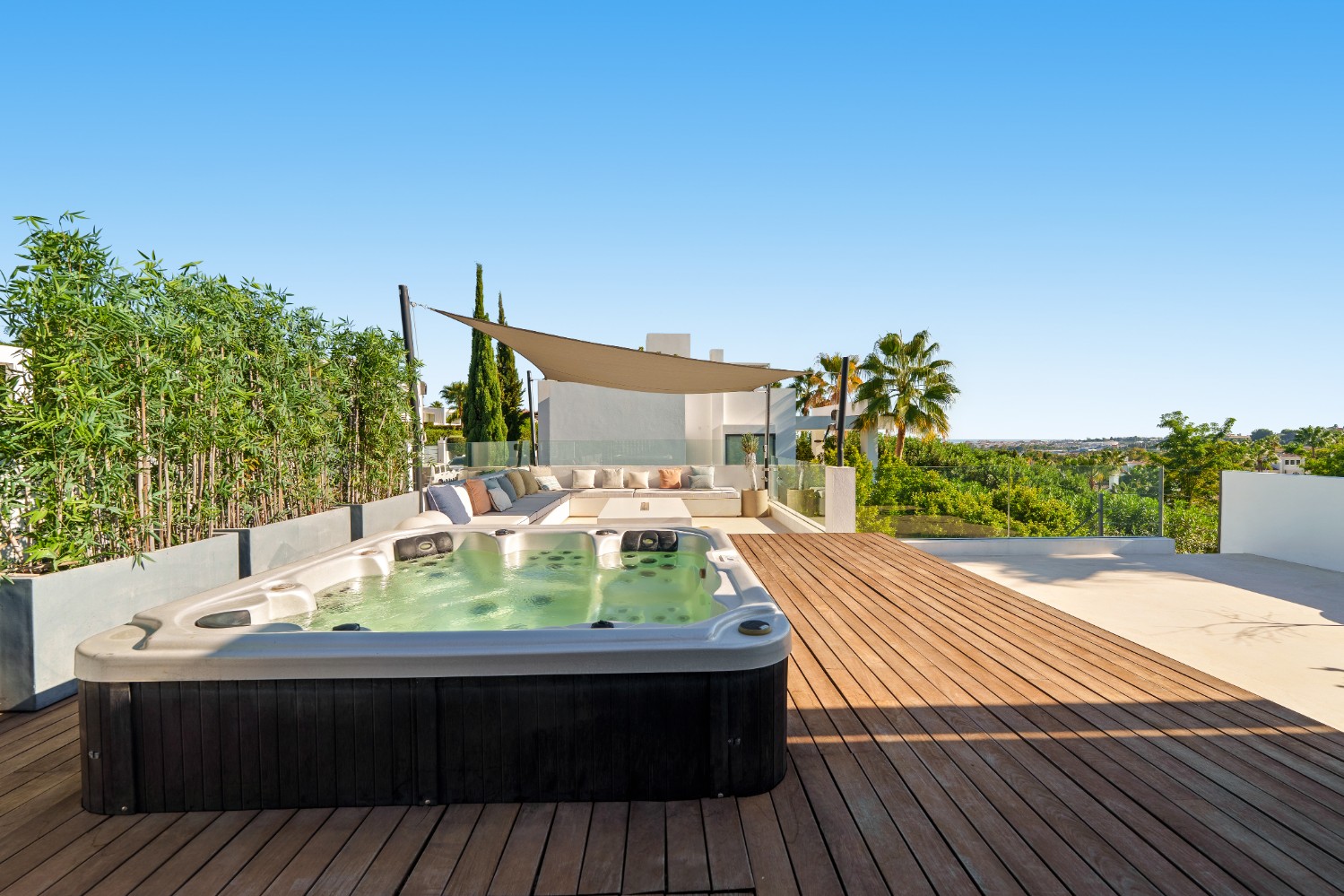 This striking contemporary villa is set within a secure private community in Nueva Andalucía, designed for both relaxation and stylish entertaining. The property is surrounded by beautifully landscaped grounds featuring lush greenery, sculpted trees, and a welcoming pergola that creates a shaded lounge area. A pristine private pool framed by smooth stone tiles serves as a refreshing centerpiece, while a spacious solarium with a bubbling jacuzzi on the upper terrace invites long afternoons of outdoor leisure.