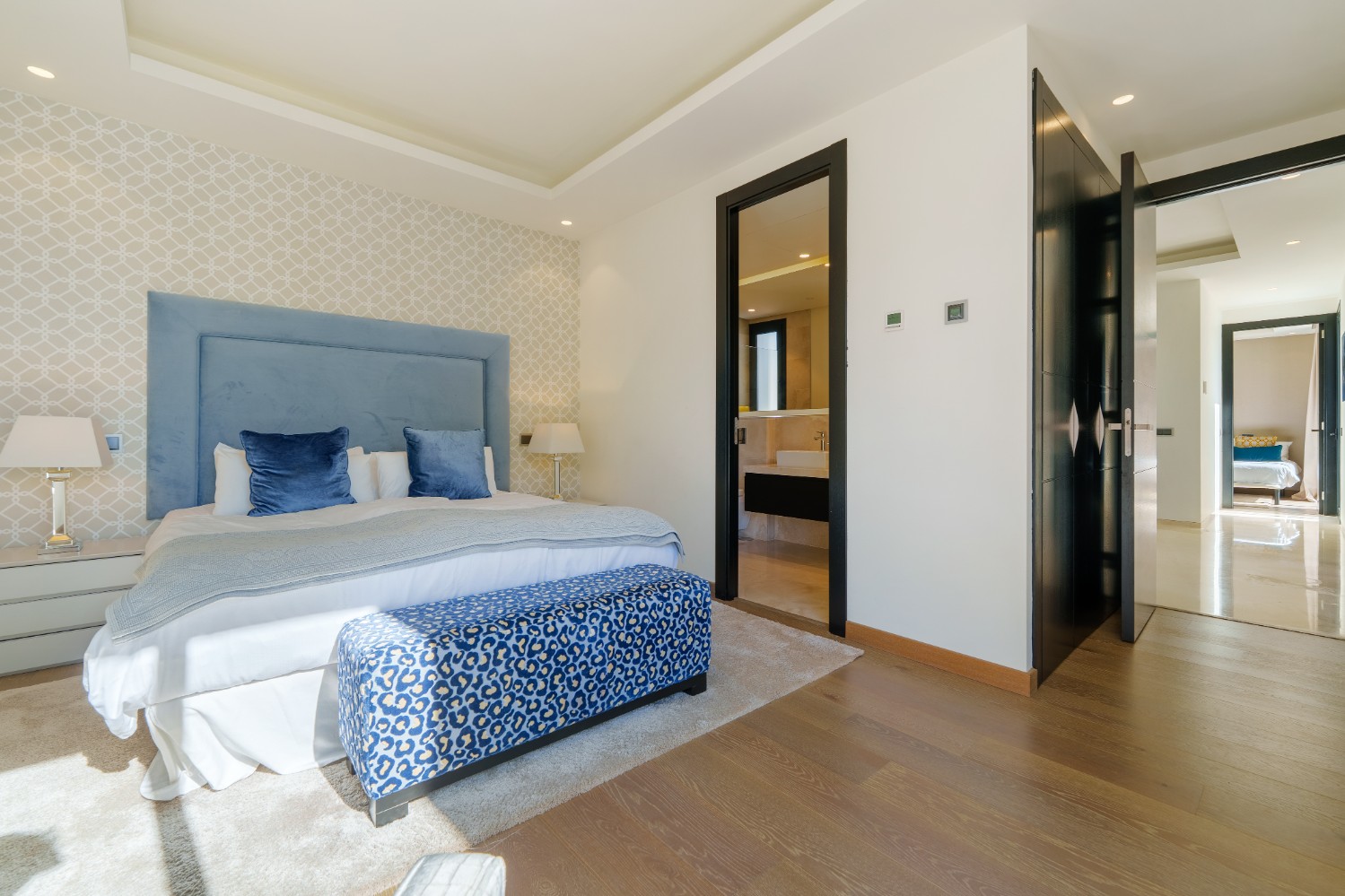 The expansive master suite serves as a tranquil retreat, complete with a sumptuous bed framed by a luxurious upholstered headboard, a walk-in closet, and direct access to a private terrace furnished for peaceful mornings or relaxing evenings. A private garage and spacious driveway enhance both convenience and security. Blending sophisticated interiors with inviting outdoor areas, this exceptional residence embodies modern Mediterranean living at its finest.