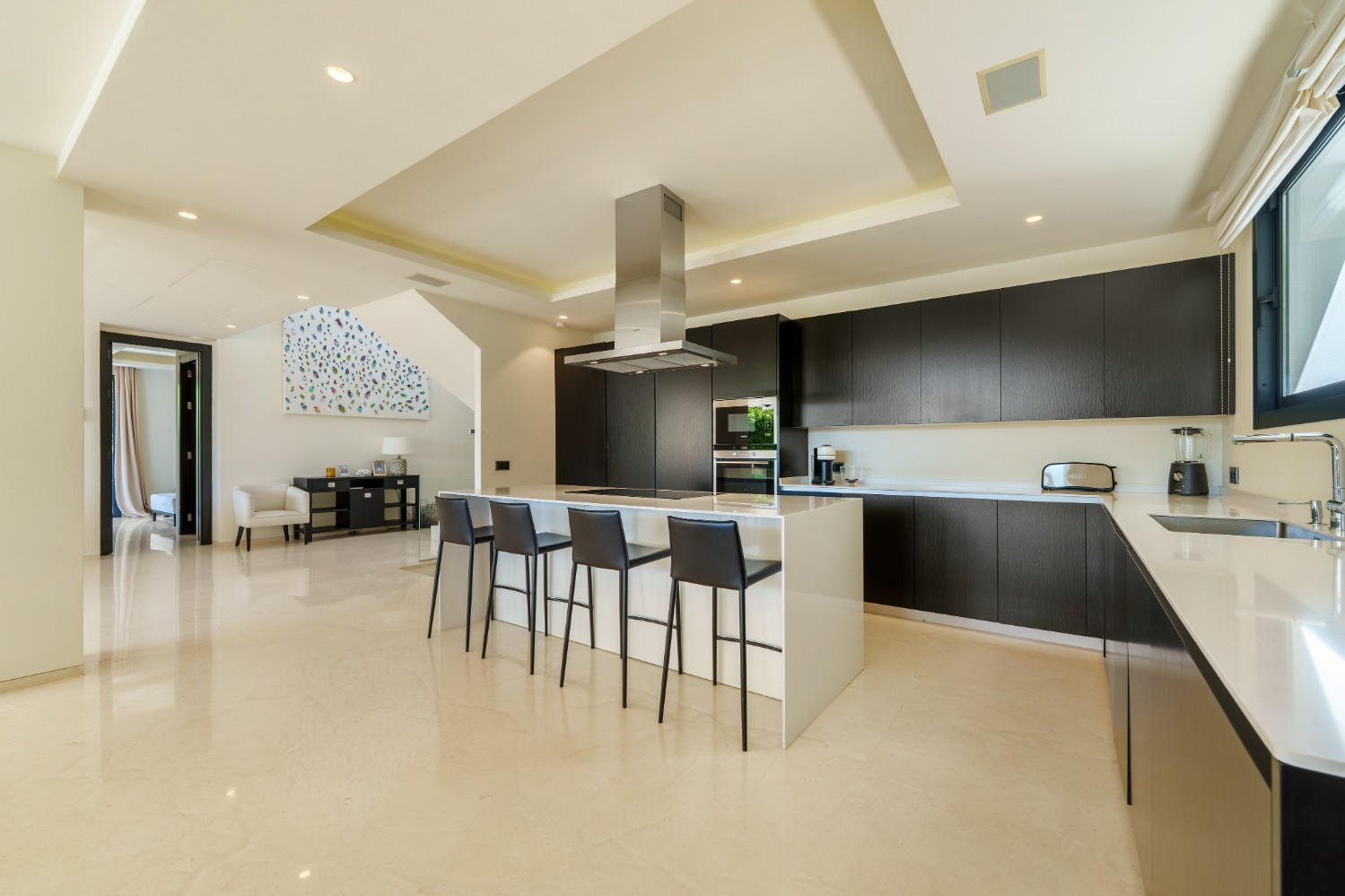 Inside, the home exudes modern elegance with polished marble floors, sleek recessed lighting, and generous open-plan spaces. The main living and dining area flows effortlessly into the state-of-the-art kitchen, complete with minimalist dark cabinetry, a large central island with seating, and premium built-in appliances. Floor-to-ceiling sliding glass doors seamlessly connect the interior to a covered dining terrace featuring a built-in grill and ample seating—perfect for al fresco meals and evening gatherings.