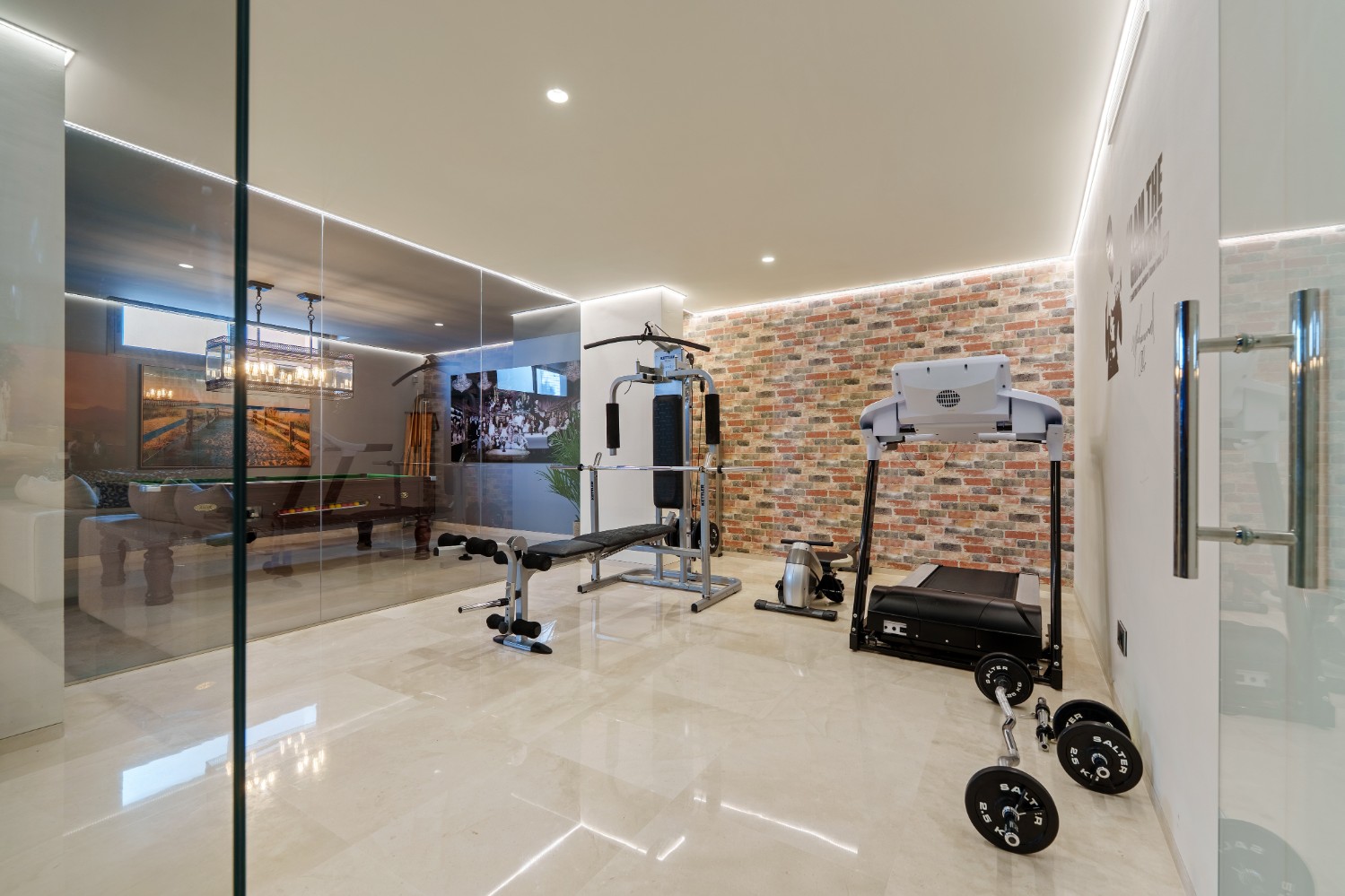 Entertainment is a key highlight. The lower-level leisure room is fitted with a stylish bar, a billiard table, and a plush lounge area accented with contemporary art, making it an ideal setting for hosting friends or unwinding in comfort. Adjacent to this space is a private glass-enclosed home gym with exposed brick detailing, offering a chic environment for workouts without ever leaving the villa.