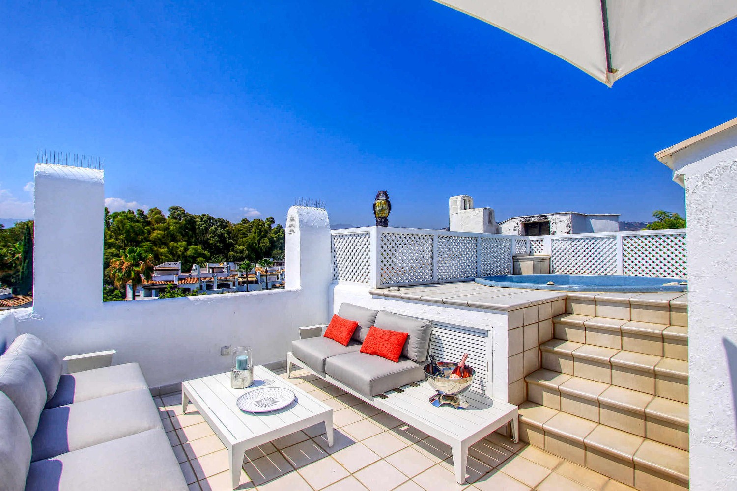 Set in the prestigious Golden Beach area of Elviria, this exceptional frontline penthouse offers breathtaking 360° panoramic views of the sea and mountains from its expansive three-level layout. Designed to accommodate up to 12 guests in comfort, the residence features five generous bedrooms, four elegant bathrooms, and a refined open-plan living space with a fully equipped modern kitchen. Sophisticated interiors flow seamlessly onto vast terraces and a spectacular rooftop retreat complete with outdoor dining areas, BBQ facilities, and jacuzzis, all perfectly positioned to capture stunning views of the Mediterranean, lush gardens, and surrounding mountains. High-speed fiber optic internet ensures modern convenience within this serene coastal setting.